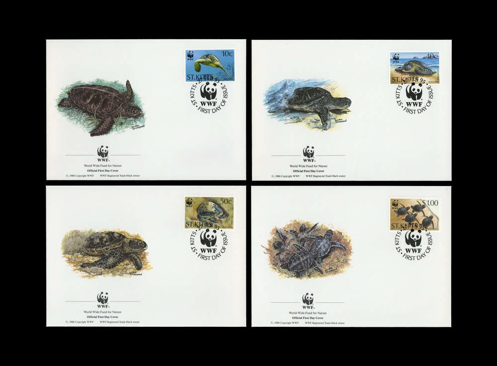 1995, 4 Werte Suppenschildkröte aus St. Kitts jeweils auf attraktivem WWF Ersttagsbrief