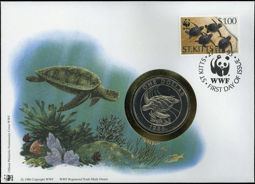 1995, 1,00 EC$ Suppenschildkröte aus St. Kitts auf dekorativem und offiziellem WWF-Numisbrief mit passendem Ersttagsstempel und der WWF Sondermünze "Suppenschildkröte - Chelonia mydas"