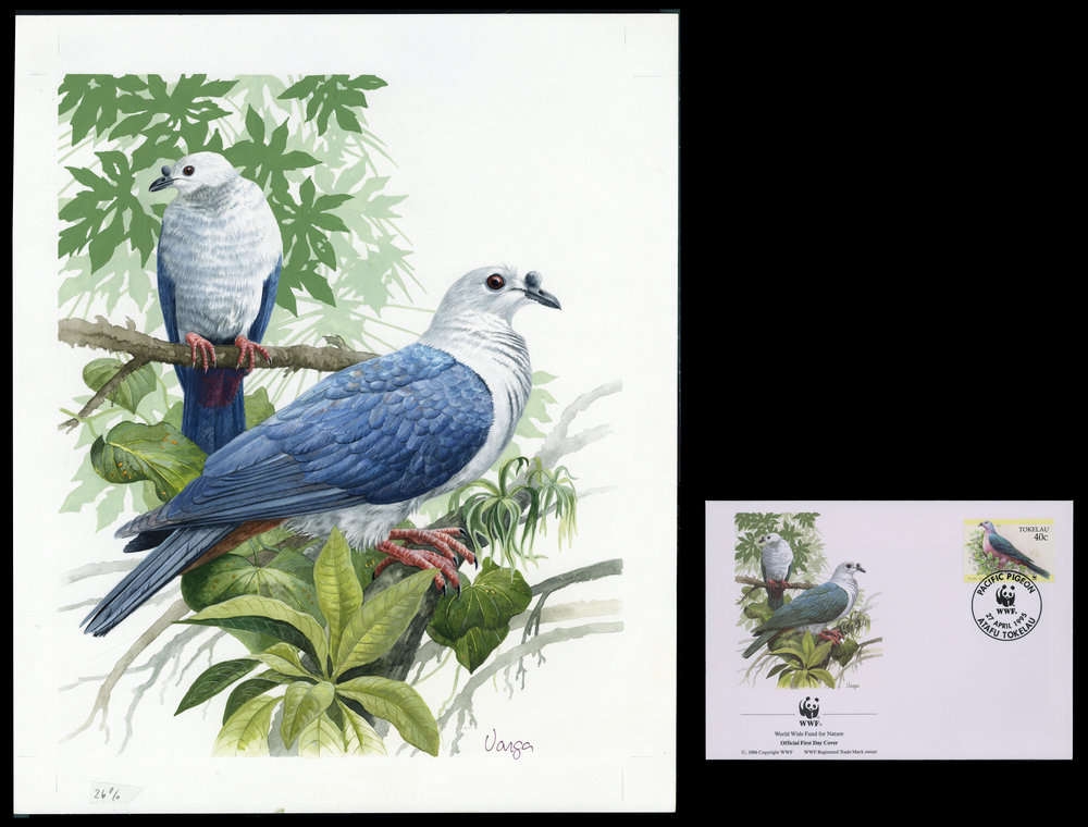 1995, Original von Hand gemaltes Kunstwerk "Pazifikfruchttaube" in Farbe für den offiziellen WWF Ersttagsbriefumschlag "Pazifikfruchttaube" (Ducula pacifica) von den Tokelau Inseln mit der Wertstufe zu 40 C. auf Kartonpapier in der Gesamtgröße 295x350 mm von dem Künstler Pál Varga/Ungarn.