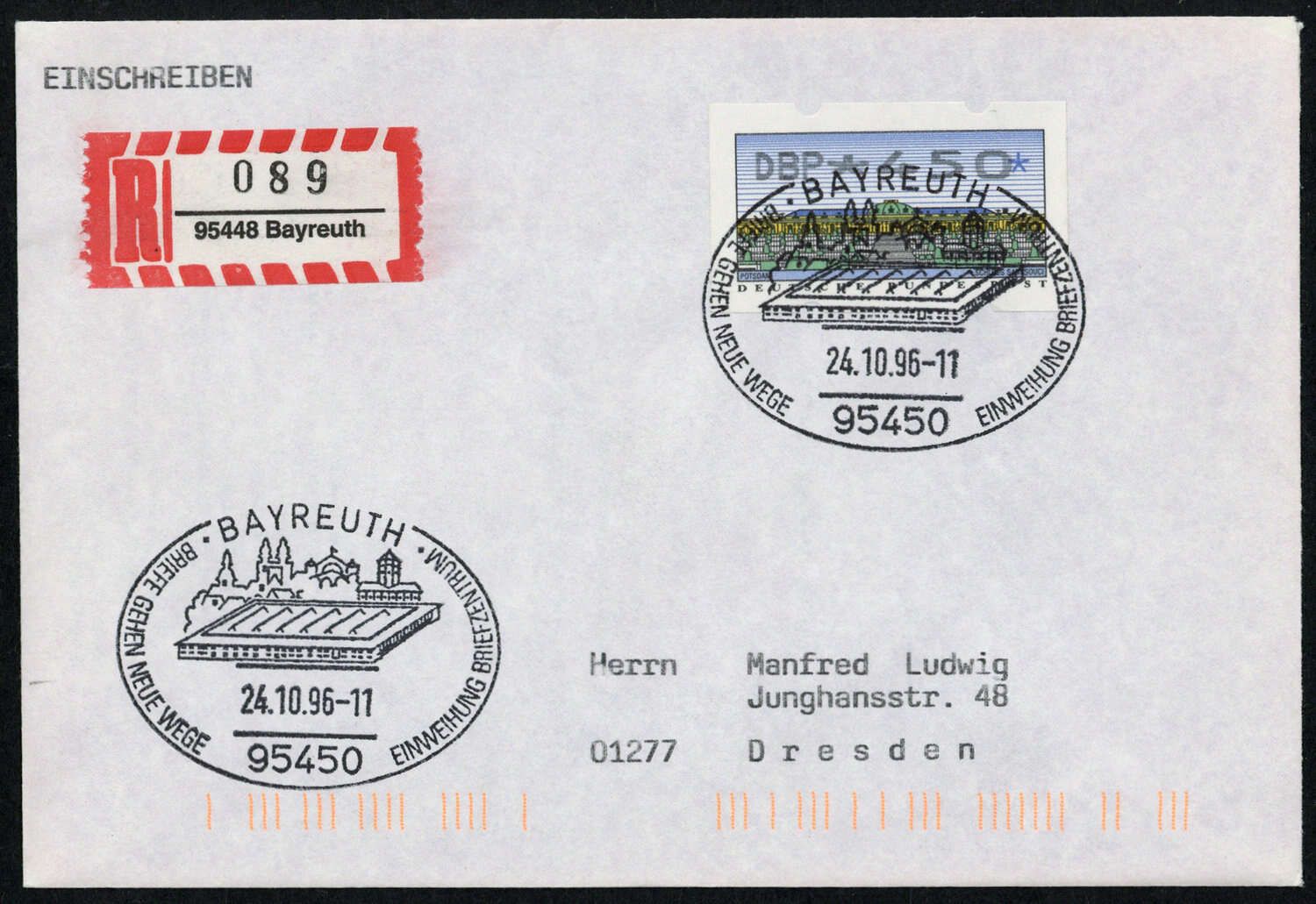 1996, 450 Pf Automatenbriefmarke auf R-Brief vom 24.10.1996 von Bayreuth mit Sonderstempel Einweihung Briefzentrum und R-Zettel Bayreuth nach Dresden mit Einlieferungsschein