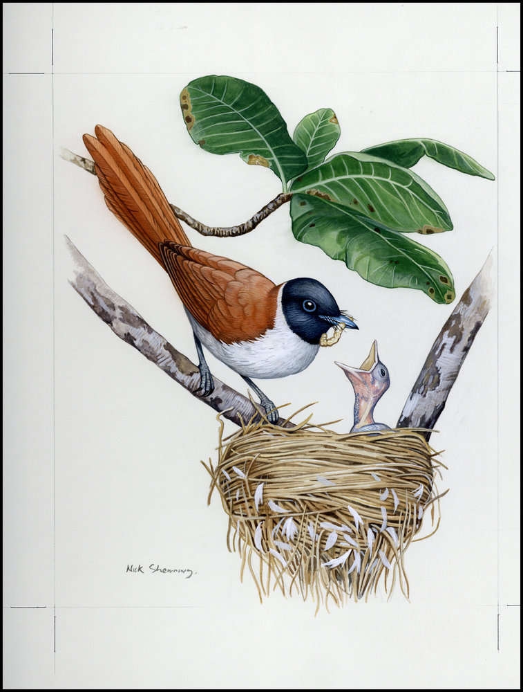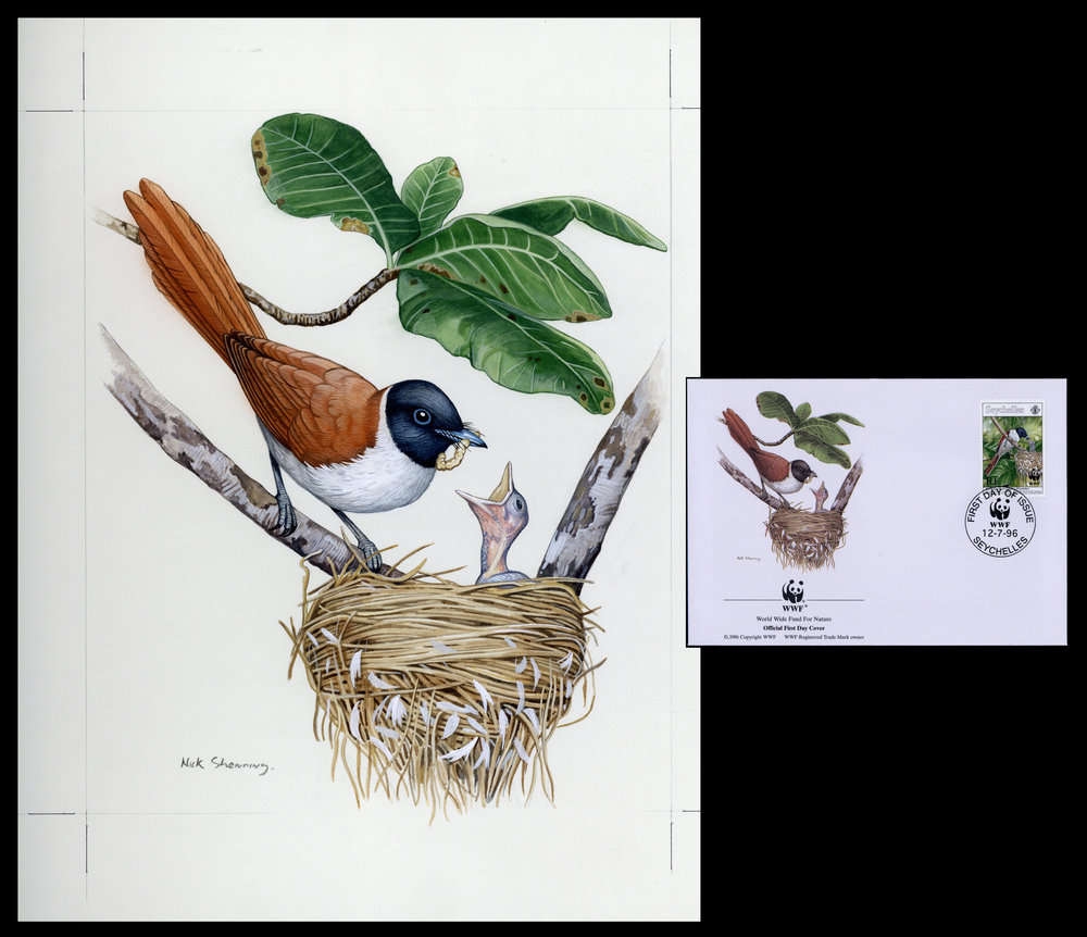 1996, Original von Hand gemaltes Kunstwerk "Seychellenparadiesschnäpper" in Farbe für den offiziellen WWF Ersttagsbriefumschlag "Seychellenparadiesschnäpper" (Terpsiphone corvina) von den Seychellen mit der Wertstufe zu 1 SR. auf Karton in der Gesamtgröße 350x400 mm von dem Künstler Nick Shewring/Großbritannien, der auch die Originalmarken der WWF Ausgabe entworfen hat!