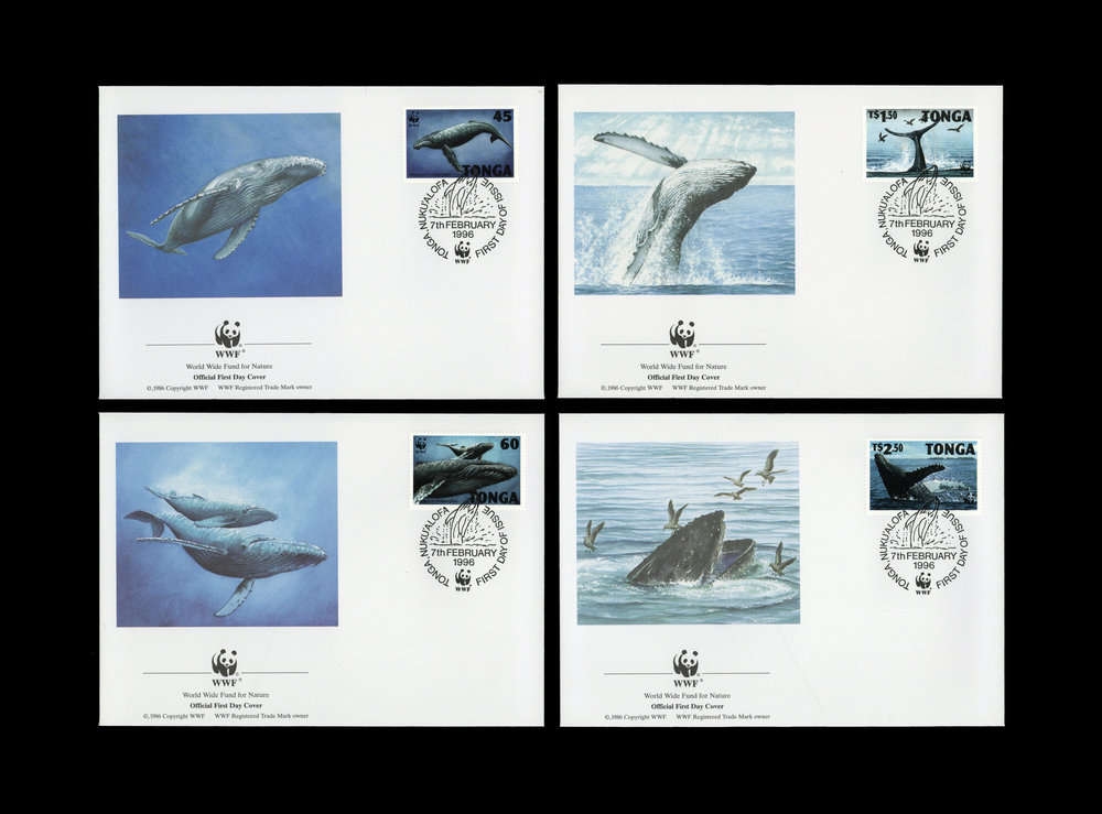 1996, 4 Werte Buckelwal aus Tonga jeweils auf attraktivem WWF Ersttagsbrief, Auflage nur 66.000