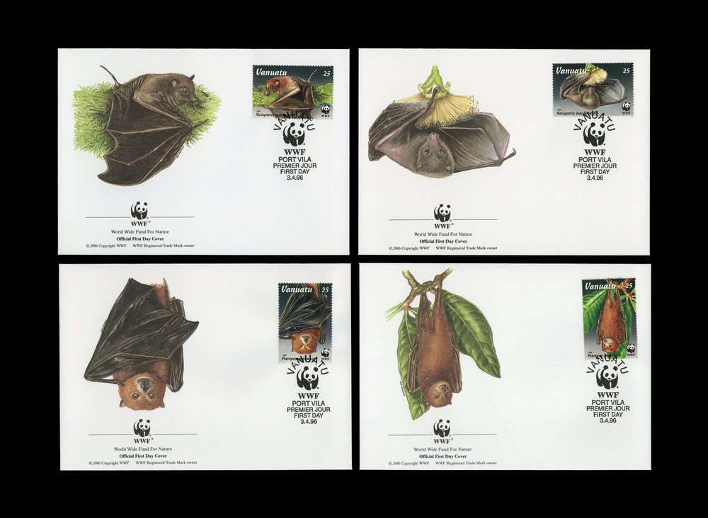 1996, 4 Werte Flughunde aus Vanuatu jeweils auf attraktivem WWF Ersttagsbrief mit Langschwanz-Flughund und Vanuatu-Flughund, Auflage nur 120.000