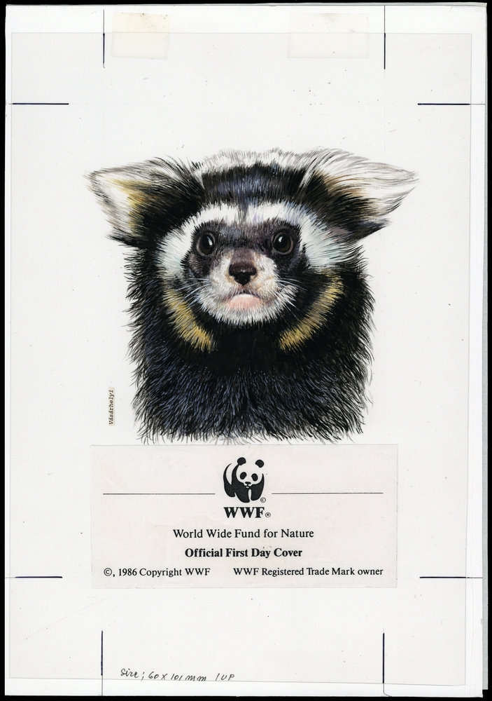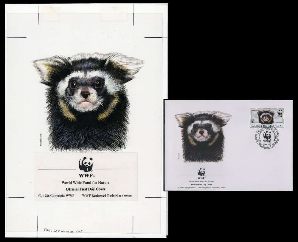 1997, Original von Hand gemaltes Kunstwerk "Tigeriltis" in Farbe für den offiziellen WWF Ersttagsbriefumschlag "Tigeriltis" (Vormela peregusna) aus Kasachstan mit der Wertstufe zu 6,00 T. auf Kartonpapier in der Gesamtgröße 205x295 mm von dem Künstler Gyula Laszlo Vasarhelyi/Großbritannien, der auch die Originalmarken der WWF Ausgabe entworfen hat!