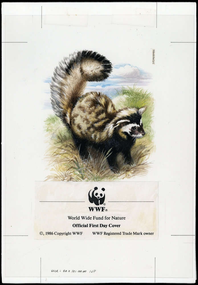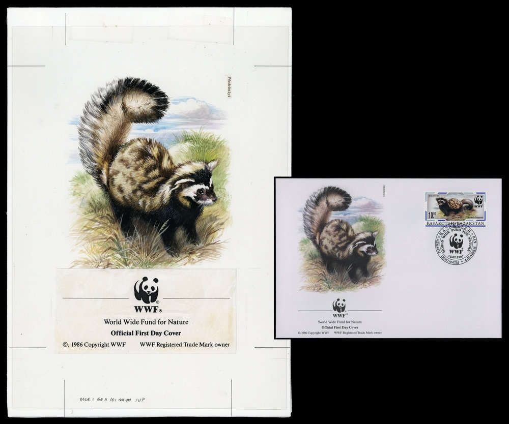 1997, Original von Hand gemaltes Kunstwerk "Tigeriltis" in Farbe für den offiziellen WWF Ersttagsbriefumschlag "Tigeriltis" (Vormela peregusna) aus Kasachstan mit der Wertstufe zu 10,00 T. auf Kartonpapier in der Gesamtgröße 203x293 mm von dem Künstler Gyula Laszlo Vasarhelyi/Großbritannien, der auch die Originalmarken der WWF Ausgabe entworfen hat!