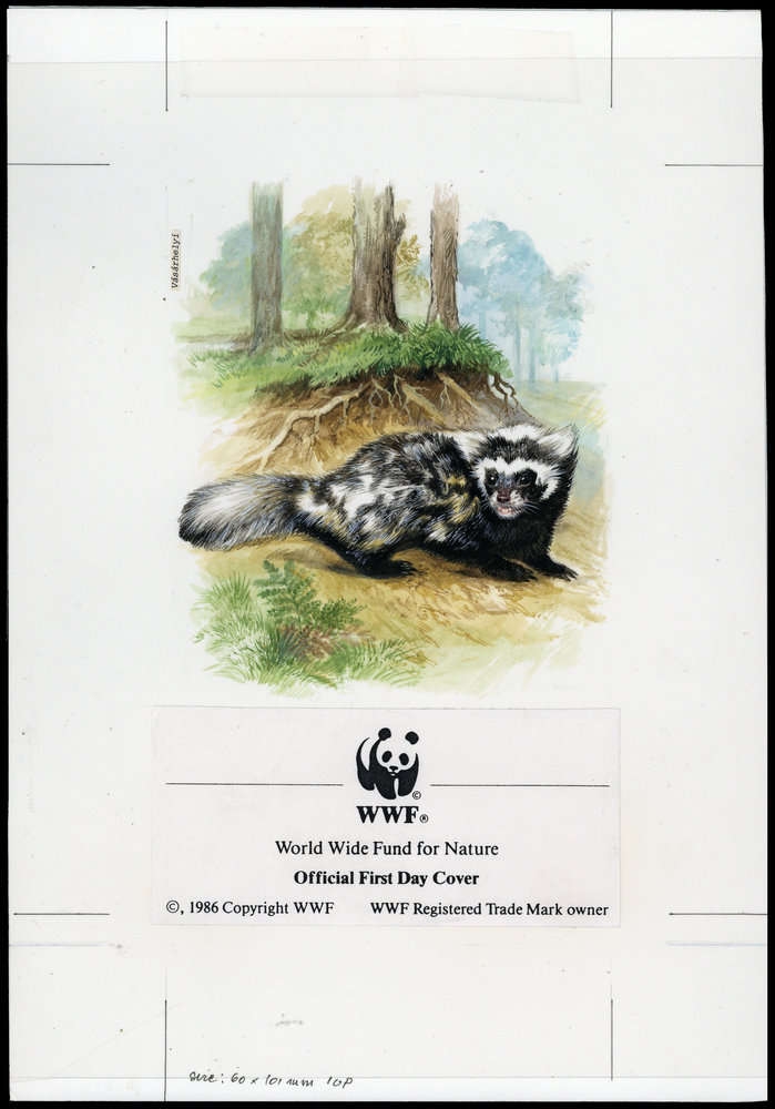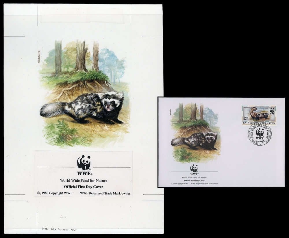 1997, Original von Hand gemaltes Kunstwerk "Tigeriltis" in Farbe für den offiziellen WWF Ersttagsbriefumschlag "Tigeriltis" (Vormela peregusna) aus Kasachstan mit der Wertstufe zu 32,00 T. auf Kartonpapier in der Gesamtgröße 206x295 mm von dem Künstler Gyula Laszlo Vasarhelyi/Großbritannien, der auch die Originalmarken der WWF Ausgabe entworfen hat!