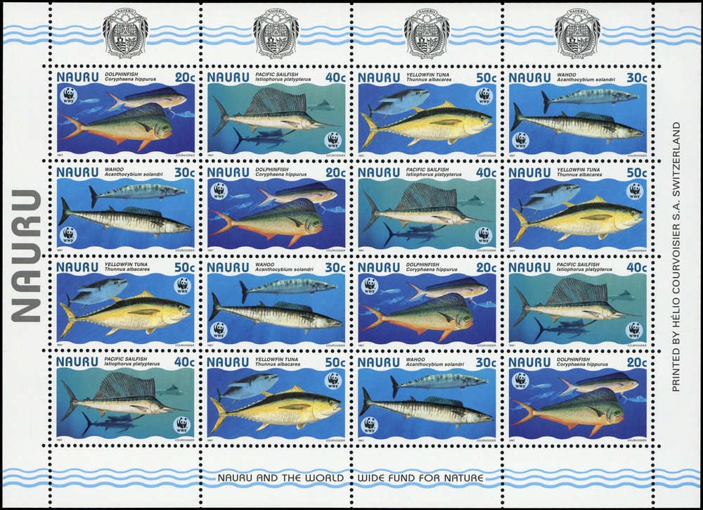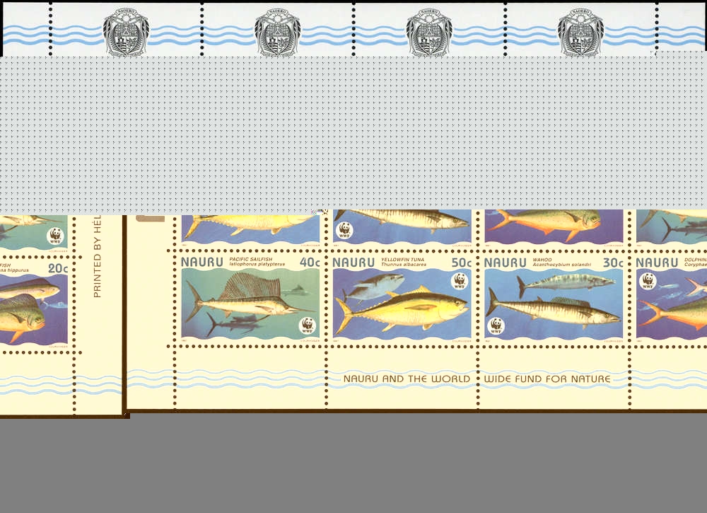 1997, 4 Werte Fische aus Nauru als postfrischer WWF-Zusammendruck- Kleinbogen mit insgesamt 4 kompletten Sätzen, mit Grosser Goldmakrele, Wahoo, Pazifischer Fächerfisch und Gelbflossen-Thunfisch, Auflage nur 60.000