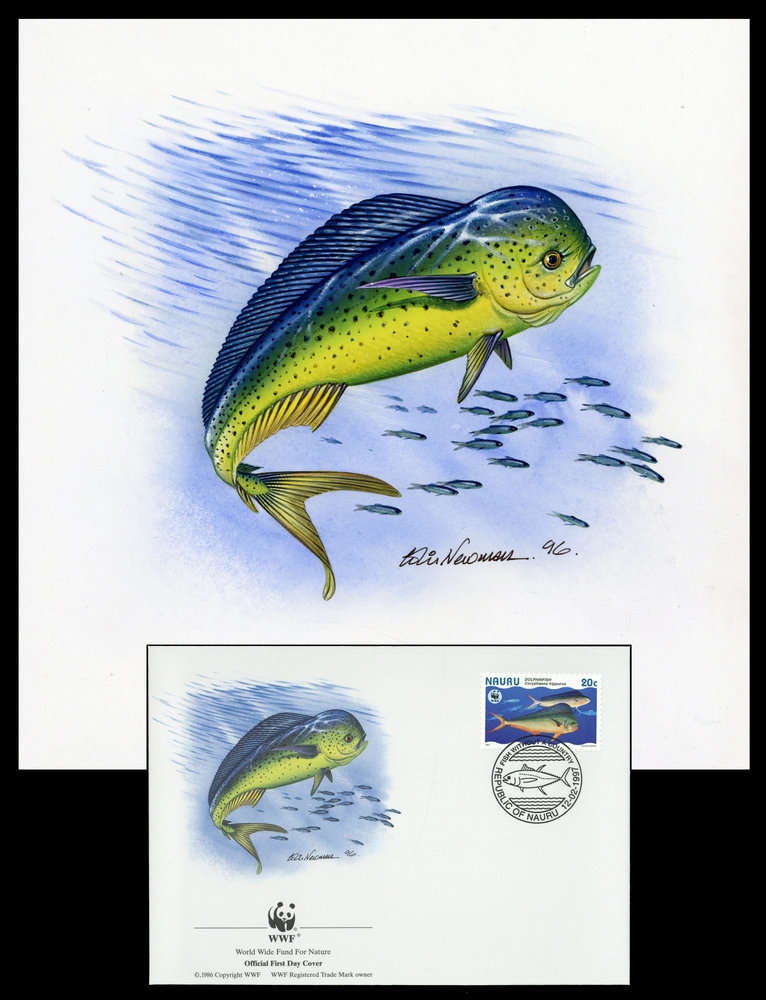 1997, Original von Hand gemaltes Kunstwerk "Grosse Goldmakrele" in Farbe für den offiziellen WWF Ersttagsbriefumschlag "Grosse Goldmakrele" (Coryphaena hippurus) aus Nauru mit der Wertstufe zu 20 C. auf Karton in der Gesamtgröße 264x305 mm von dem Künstler Colin Newman/Großbritannien.