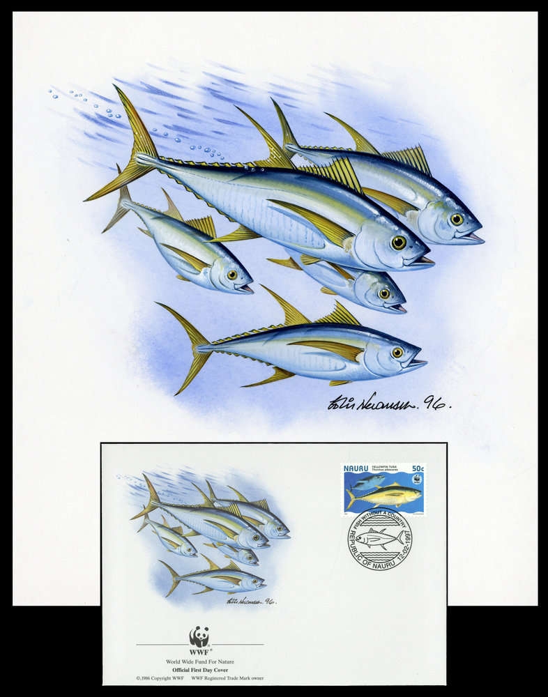 1997, Original von Hand gemaltes Kunstwerk "Gelbflossen-Thunfisch" in Farbe für den offiziellen WWF Ersttagsbriefumschlag "Gelbflossen-Thunfisch" (Thunnus albacares) aus Nauru mit der Wertstufe zu 50 C. auf Karton in der Gesamtgröße 267x308 mm von dem Künstler Colin Newman/Großbritannien.