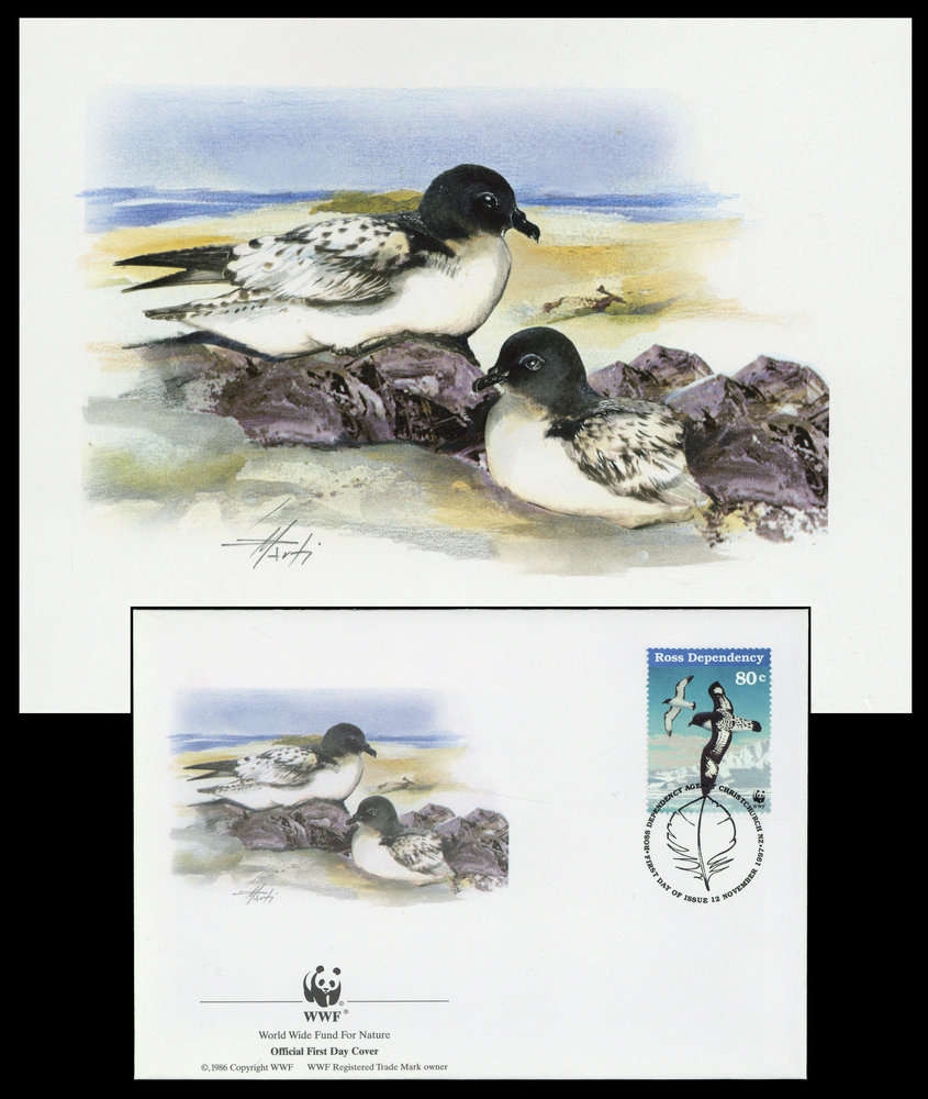 1997, Original von Hand gemaltes Kunstwerk "Kapsturmvogel" in Farbe für den offiziellen WWF Ersttagsbriefumschlag "Kapsturmvogel" (Daption capense) aus dem Ross Gebiet mit der Wertstufe zu 80 C. auf Kartonpapier in der Gesamtgröße 226x202 mm von dem Künstler Sepp Marty/Schweiz.