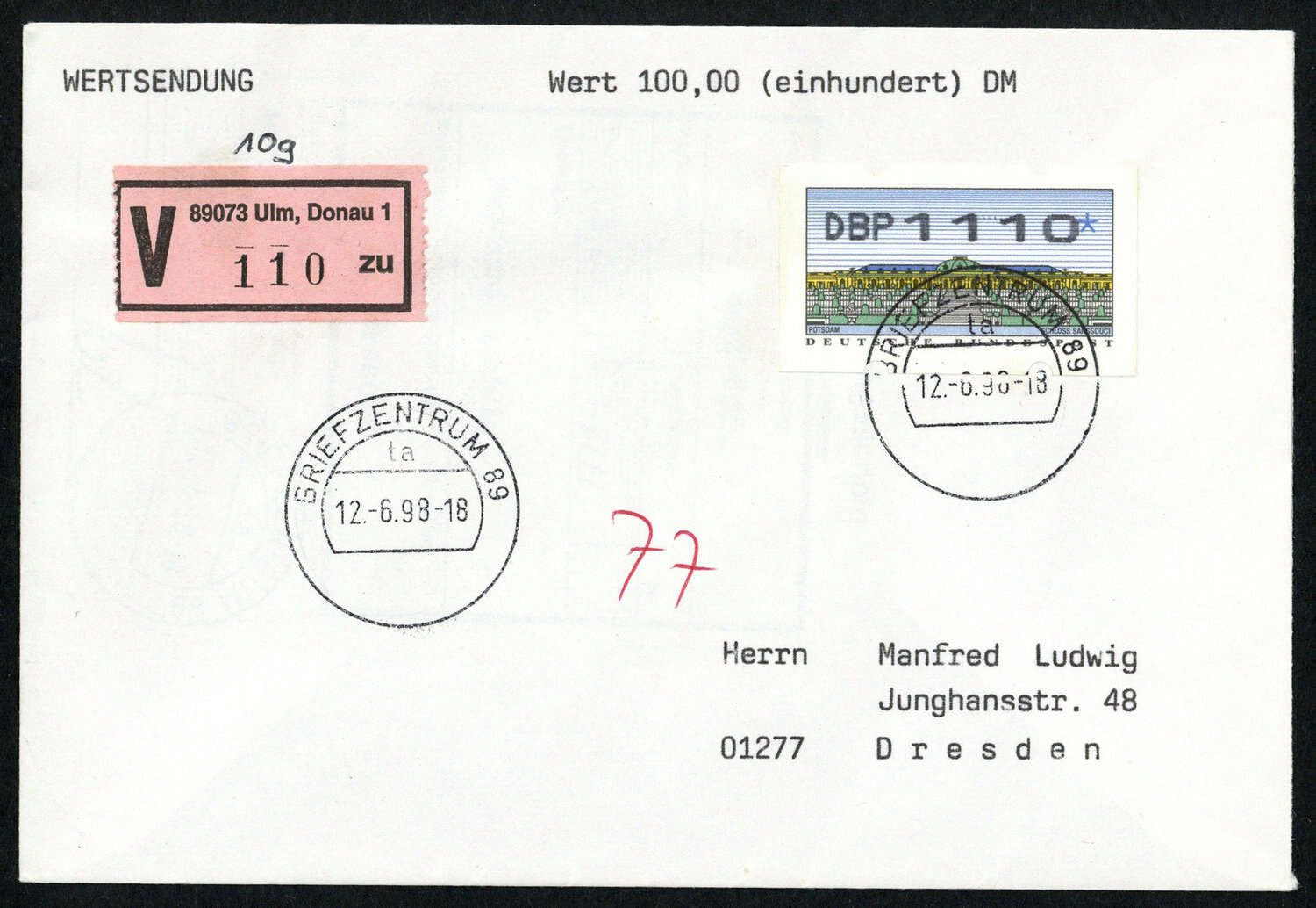 1998, 1110 Pf Automatenbriefmarke auf Wert Brief 100 DM vom 12.06.1998 vom Briefzentrum 89 Ub ta und Wertzettel Ulm,Donau 1 Ub zu nach Dresden mit Einlieferungsschein