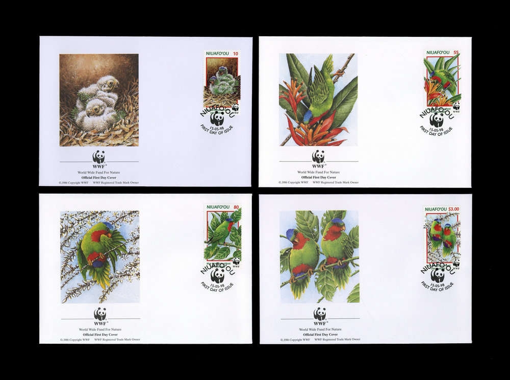 1998, 4 Werte Vögel von den Niuafoou Inseln jeweils auf attraktivem WWF Ersttagsbrief mit Blaukappenlori