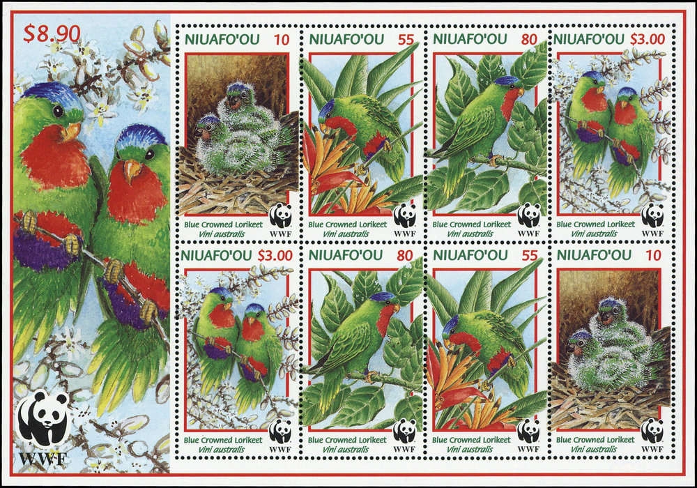 1998, 4 Werte Blaukappenlori von den Niuafoou Inseln als postfrischer WWF-Zusammendruck- Kleinbogen mit insgesamt 2 kompletten Sätzen