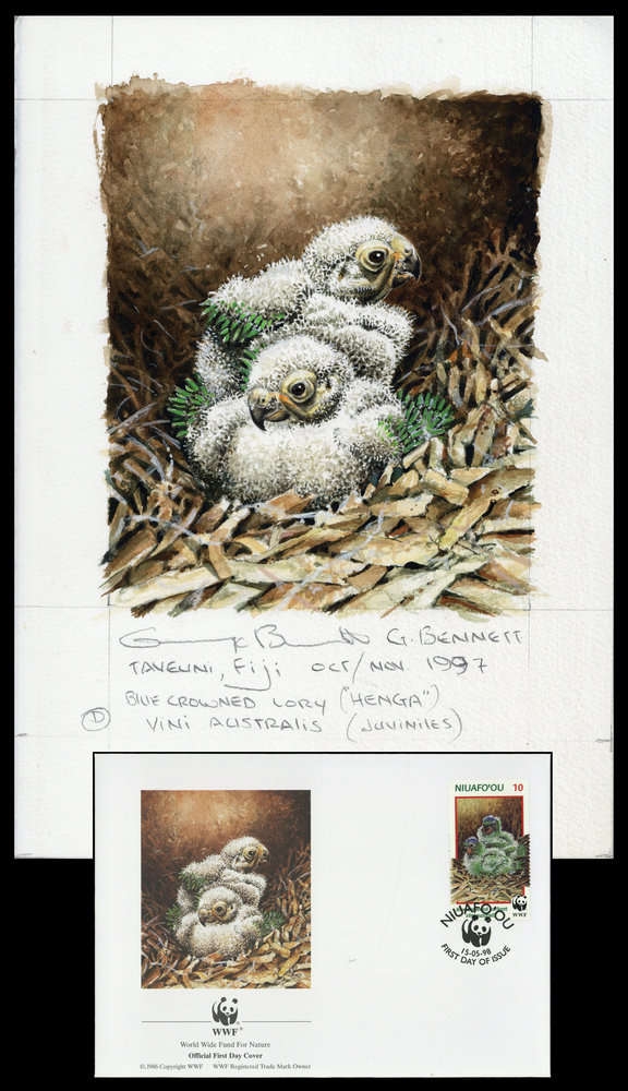 1998, Original von Hand gemaltes Kunstwerk "Blaukappenlori" in Farbe für den offiziellen WWF Ersttagsbriefumschlag "Blaukappenlori" (Vini australis) von den Niuafoou Inseln mit der Wertstufe zu 10 S. auf Kartonpapier in der Gesamtgröße 215x300 mm von dem Künstler George Bennett/Australien.