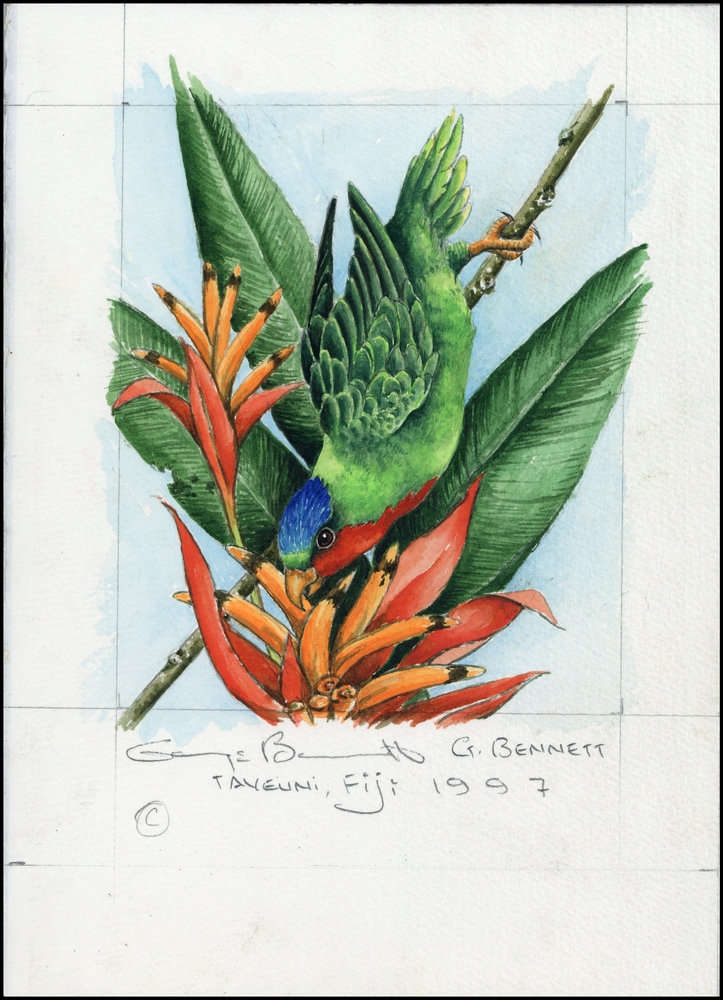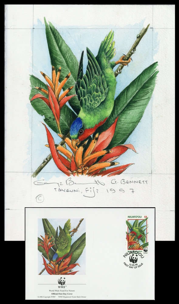 1998, Original von Hand gemaltes Kunstwerk "Blaukappenlori" in Farbe für den offiziellen WWF Ersttagsbriefumschlag "Blaukappenlori" (Vini australis) von den Niuafoou Inseln mit der Wertstufe zu 55 S. auf Kartonpapier in der Gesamtgröße 215x295 mm von dem Künstler George Bennett/Australien.