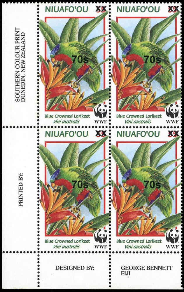 1998, 70 auf 55 S. WWF Vogel "Blaukappenlori" mit Überdruck und durchkreuzter alter Wertziffer als postfrischer Eckrand 4-er Block links unten mit Druckereivermerk. In dieser Form nicht im Michel 2012 notiert!
