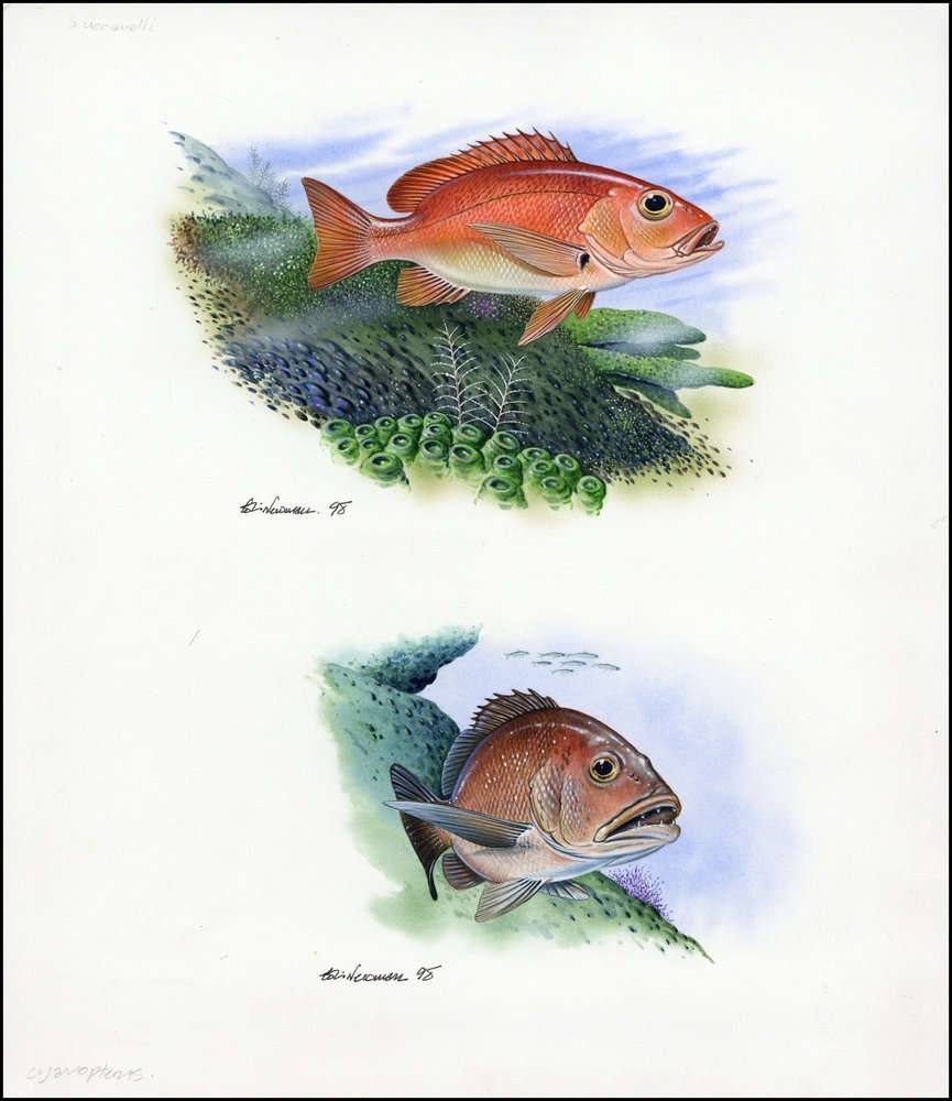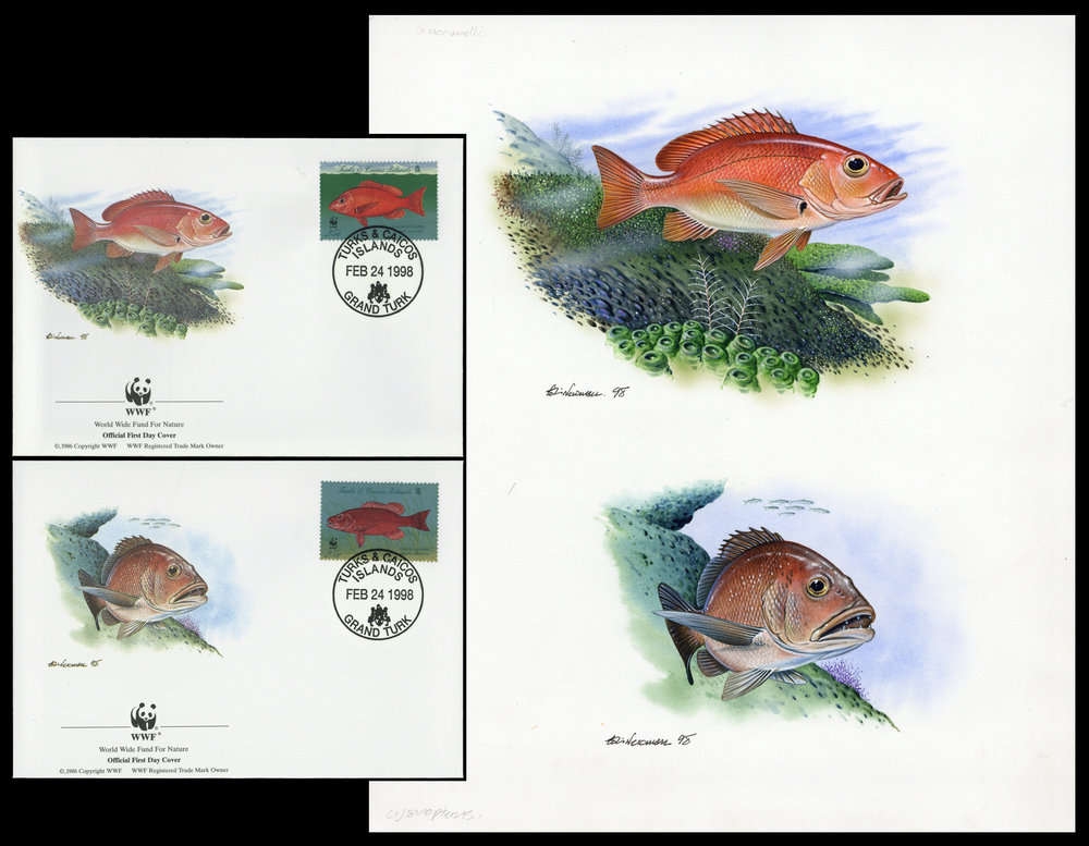 1998, Original von Hand gemaltes Kunstwerk "Schwarzflossenschnapper" und "Hundsschnapper" in Farbe für die beiden offiziellen WWF Ersttagsbriefumschläge "Schwarzflossenschnapper" (Lutjanus buccanella) und "Hundsschnapper" (Lutjanus jocu) von den Turks- & Caicos-Inseln jeweils mit der Wertstufe zu 25 C. auf Kartonpapier in der Gesamtgröße 256x295 mm von dem Künstler Colin Newman/Großbritannien.