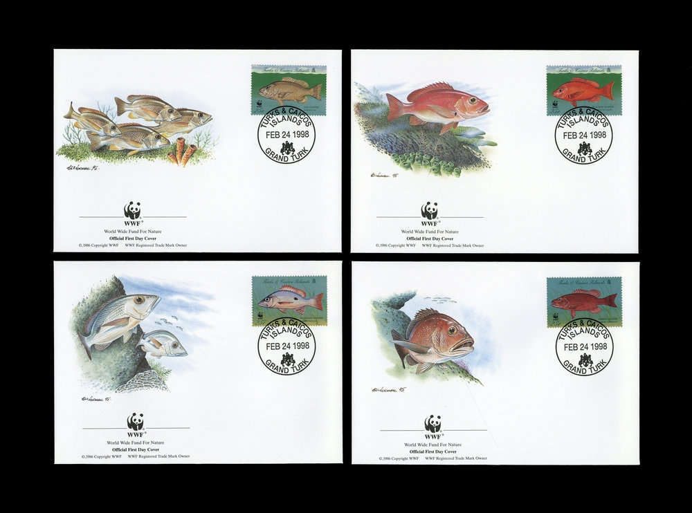 1998, 4 Werte Fische von den Turks und Caicos Inseln jeweils auf attraktivem WWF Ersttagsbrief mit Schwarzflossenschnapper, Hundsschnapper, Cuberaschnapper und Mahagonischnapper