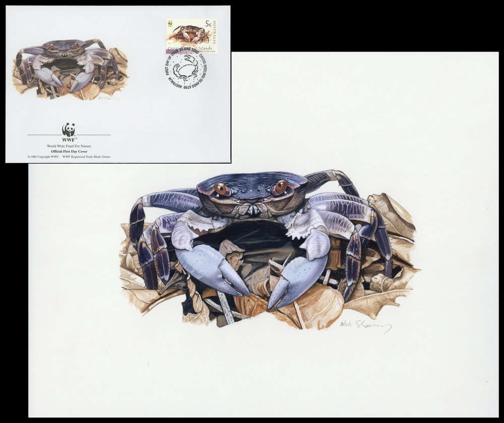 2000, Original von Hand gemaltes Kunstwerk "Kleine Kneifkrabbe" in Farbe für den offiziellen WWF Ersttagsbriefumschlag "Kleine Kneifkrabbe" (Geograpsus grayi) von den Kokos-Inseln mit der Wertstufe zu 5 C. auf Karton in der Gesamtgröße 340x264 mm von dem Künstler Nick Shewring/Großbritannien.