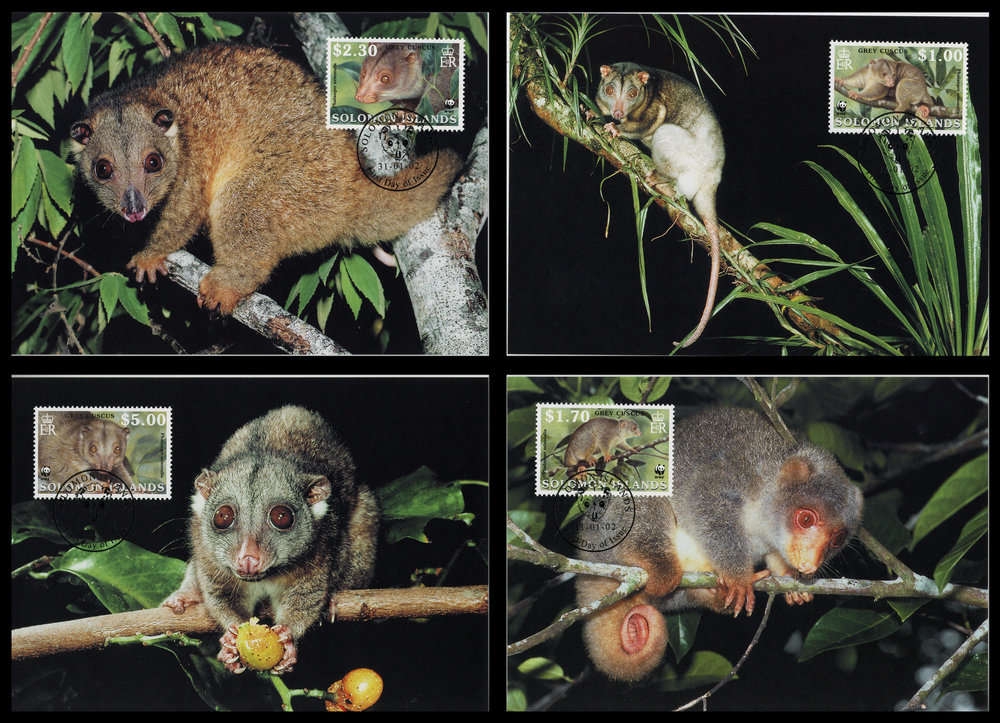 2002, 4 Werte Tiere von den Salomoninseln jeweils auf dekorativer WWF Maximumkarte mit Nördlichem Wollkuskus