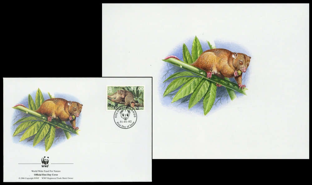 2002, Original von Hand gemaltes Kunstwerk "Nördlicher Wollkuskus" in Farbe für den offiziellen WWF Ersttagsbriefumschlag "Nördlicher Wollkuskus" (Phalanger orientalis) von den Salomoninseln mit der Wertstufe zu 1,00 SI$ auf Papier in der Gesamtgröße 227x172 mm von dem Künstler Andrew Robinson/Großbritannien.