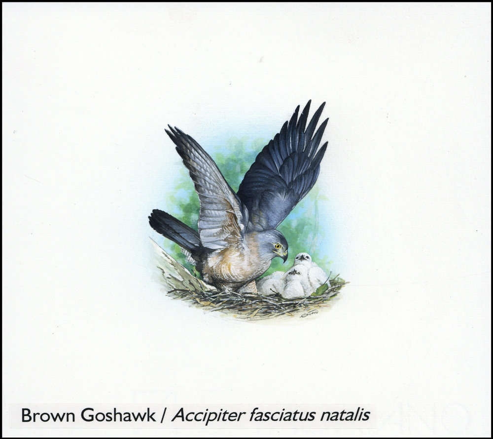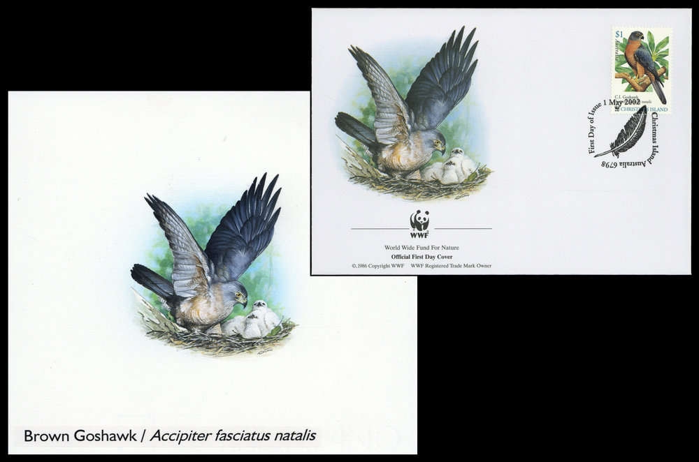 2002, Original von Hand gemaltes Kunstwerk "Weihnachtsinsel-Bänderhabicht" in Farbe für den offiziellen WWF Ersttagsbriefumschlag "Weihnachtsinsel-Bänderhabicht" (Accipiter fasciatus natalis) von den Weihnachtsinseln mit der Wertstufe zu 1 $A auf Kartonpapier in der Gesamtgröße 175x156 mm von dem Künstler Owen Bell/Australien.
