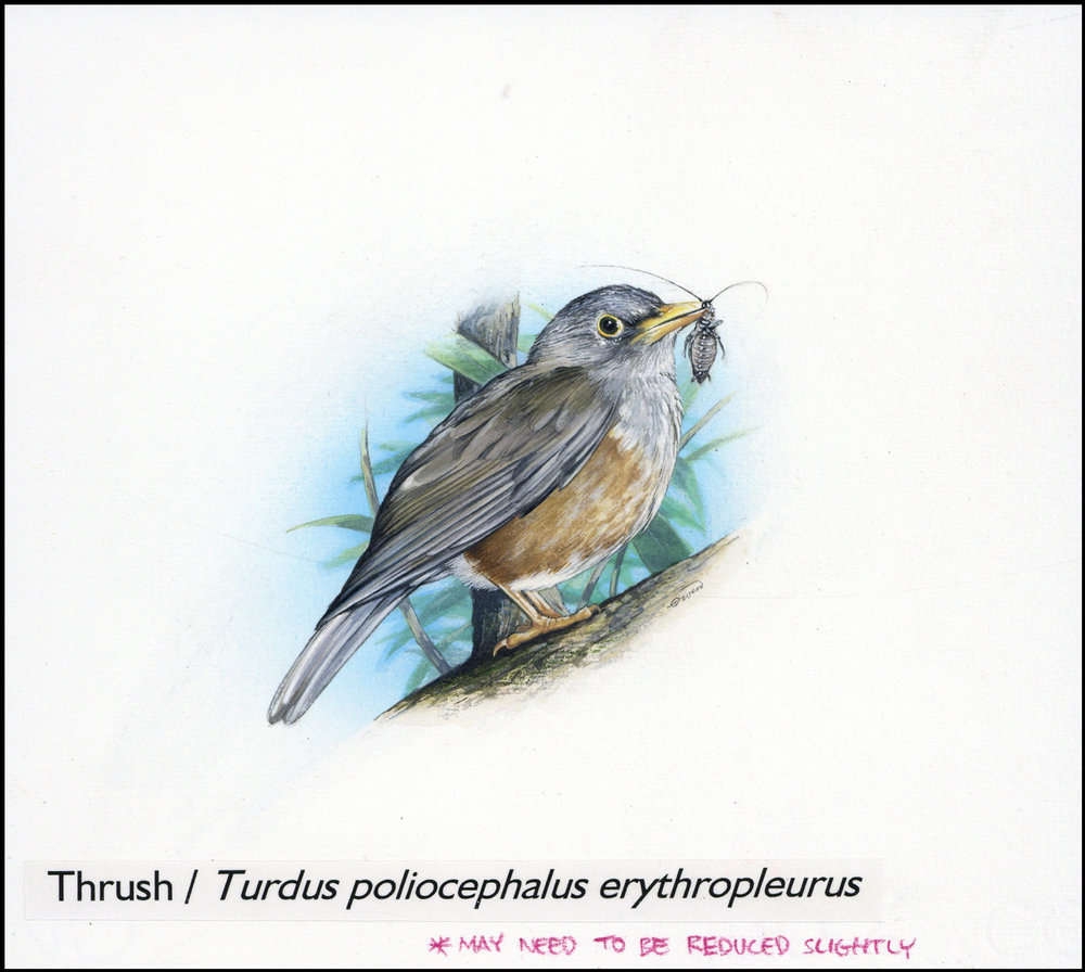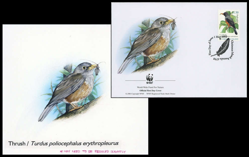 2002, Original von Hand gemaltes Kunstwerk "Weihnachtsinsel-Südseedrossel" in Farbe für den offiziellen WWF Ersttagsbriefumschlag "Weihnachtsinsel-Südseedrossel" (Turdus poliocephalus erythropleurus) von den Weihnachtsinseln mit der Wertstufe zu 1,50 $A auf Kartonpapier in der Gesamtgröße 175x157 mm von dem Künstler Owen Bell/Australien.