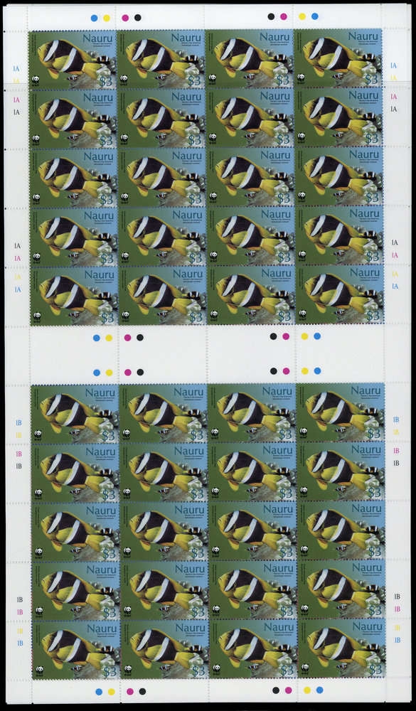 2003, 4 Werte WWF "Anemonenfische" als postfrischer Original Bogensatz mit insgesamt 40 kompletten Sätzen, davon 4 senkrechte Zwischenstegpaar- Sätze (ME 400.-++)