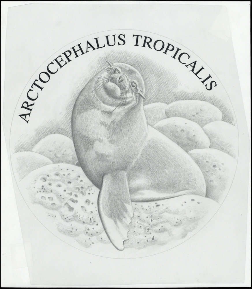 2004, Original von Hand gezeichnetes Kunstwerk "Subantarktischer Seebär" in Schwarz/Weiß für die Münze von dem offiziellen WWF Numisbrief "Subantarktischer Seebär" (Arctocephalus tropicalis) aus Tristan da Cunha auf Kartonpapier in der Gesamtgröße 219x251 mm deren Numisbrief-Umschlag der Künstler Pál Varga/Ungarn entworfen hat