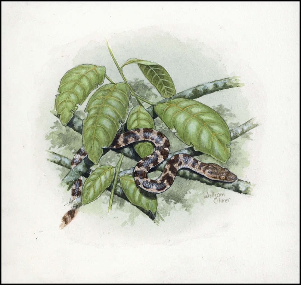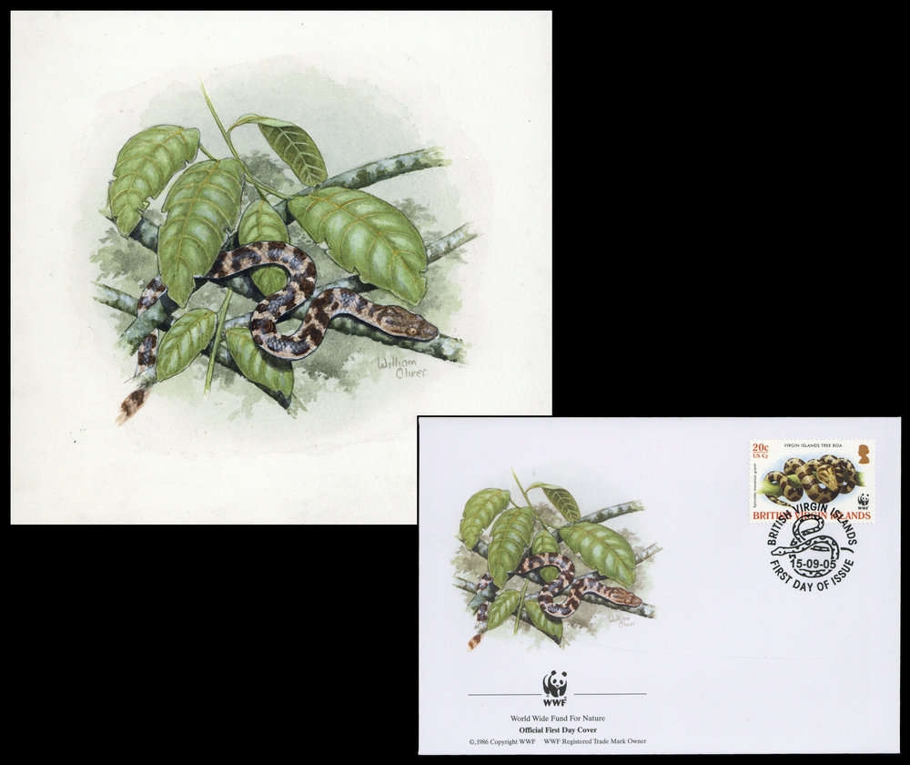 2005, Original von Hand gemaltes Kunstwerk "Jungferninsel-Schlankboa" in Farbe für den offiziellen WWF Ersttagsbriefumschlag "Jungferninsel-Schlankboa" (Epicrates monensis granti) von den Britischen Jungferninseln mit der Wertstufe zu 20 C. auf Karton in der Gesamtgröße 185x175 mm von dem Künstler William Oliver/Großbritannien.