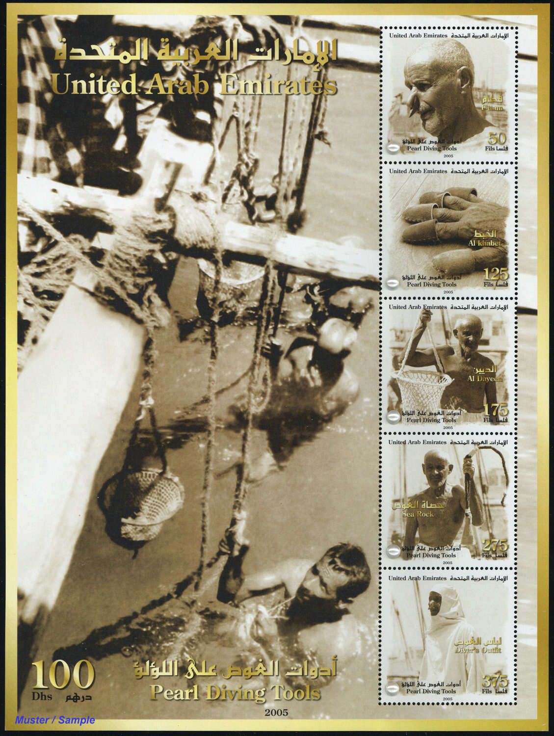 2005, 21. Dez. Ausrüstungsgegenstände eines Perlentauchers, Blockausgabe, Marken mit aufgeklebten Perlen in postfrischer Erhaltung