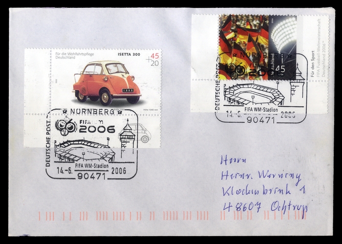 2006, "NÜRNBERG FIFA-WM 2006 14.6.2006 FIFA WM-Stadion", SST auf Brief mit 2 Marken vom Eckrand nach Ochtrup