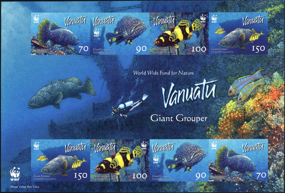 2006, 4 Werte WWF "Riesenzackenbarsch" als postfrischer ungezähnter WWF Zusammendruck- Kleinbogen mit insgesamt 2 kompletten ungezähnten Sätzen. Ein seltener Kleinbogen, der selbst in der Preisliste 2013 der Fa.Groth AG "Spezielle Ausgaben WWF" nicht angeboten wurde!