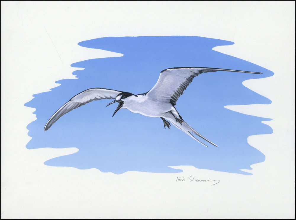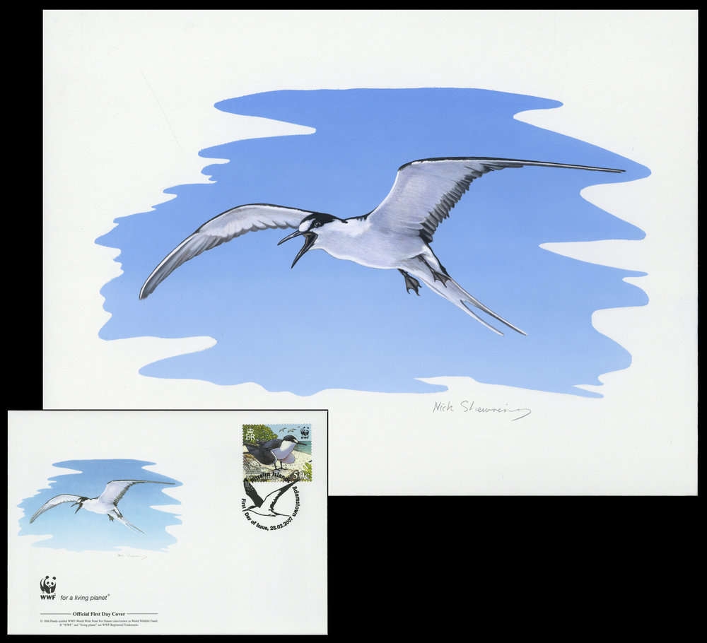2007, Original von Hand gemaltes Kunstwerk "Russseeschwalbe" in Farbe für den offiziellen WWF Ersttagsbriefumschlag "Russseeschwalbe" (Sterna fuscata) von den Pitcairn-Inseln mit der Wertstufe zu 50 C. auf Karton in der Gesamtgröße 331x250 mm von dem Künstler Nick Shewring/Großbritannien.