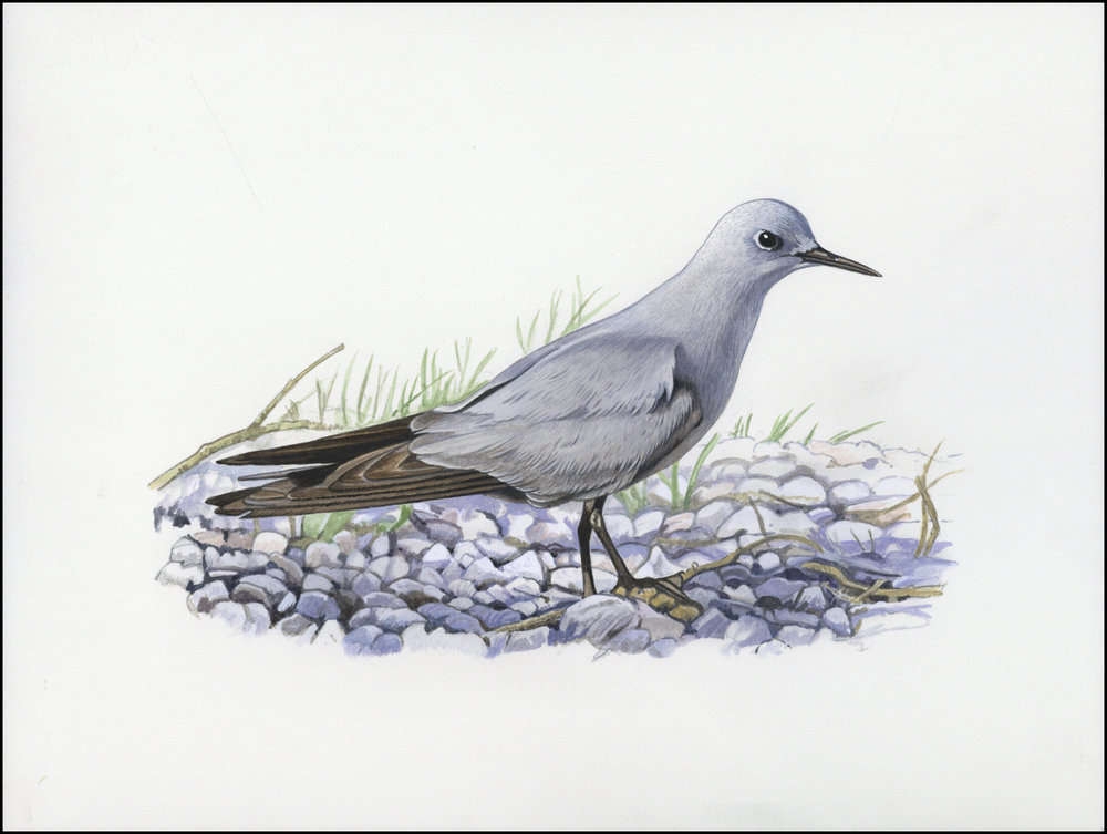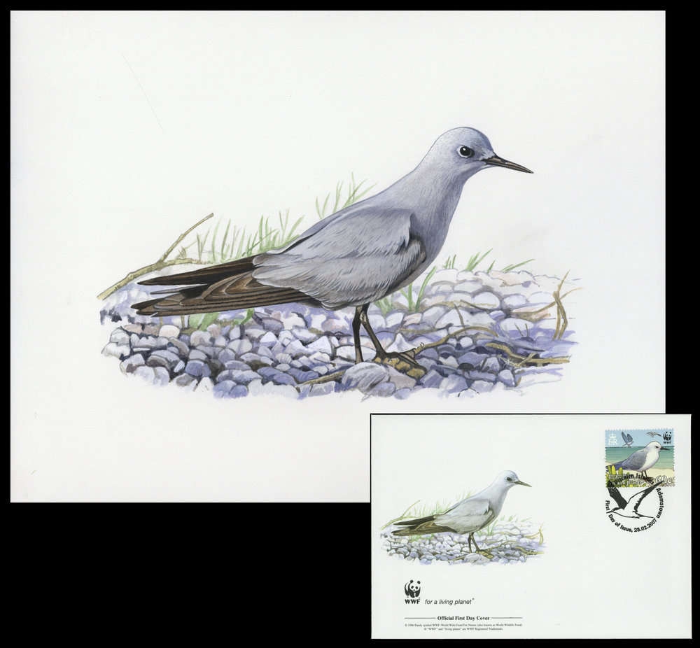 2007, Original von Hand gemaltes Kunstwerk "Grauseeschwalbe" in Farbe für den offiziellen WWF Ersttagsbriefumschlag "Grauseeschwalbe" (Procelsterna cerulea) von den Pitcairn-Inseln mit der Wertstufe zu 60 C. auf Karton in der Gesamtgröße 331x249 mm von dem Künstler Nick Shewring/Großbritannien.