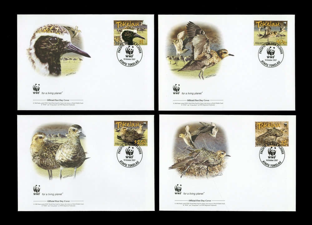 2007, 4 Werte Vögel von den Tokelau Inseln jeweils auf attraktivem WWF Ersttagsbrief mit Pazifischer Goldregenpfeifer