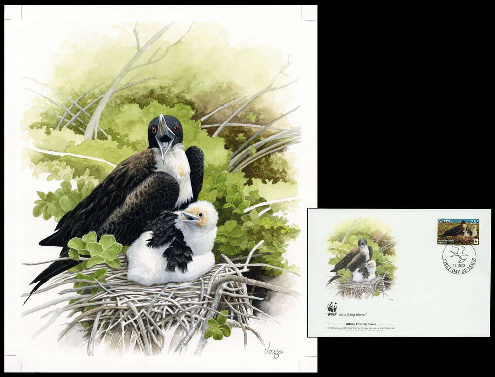 2008, Original von Hand gemaltes Kunstwerk "Bindenfregattvogel" in Farbe für den offiziellen WWF Ersttagsbriefumschlag "Bindenfregattvogel" (Fregata minor) von Nauru mit der Wertstufe zu 25 C. auf Kartonpapier in der Gesamtgröße 278x326 mm von dem Künstler Pál Varga/Ungarn.