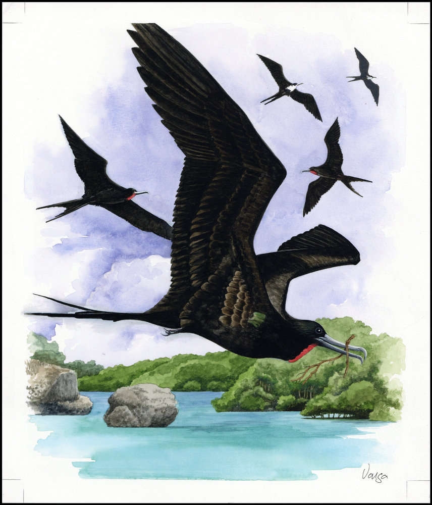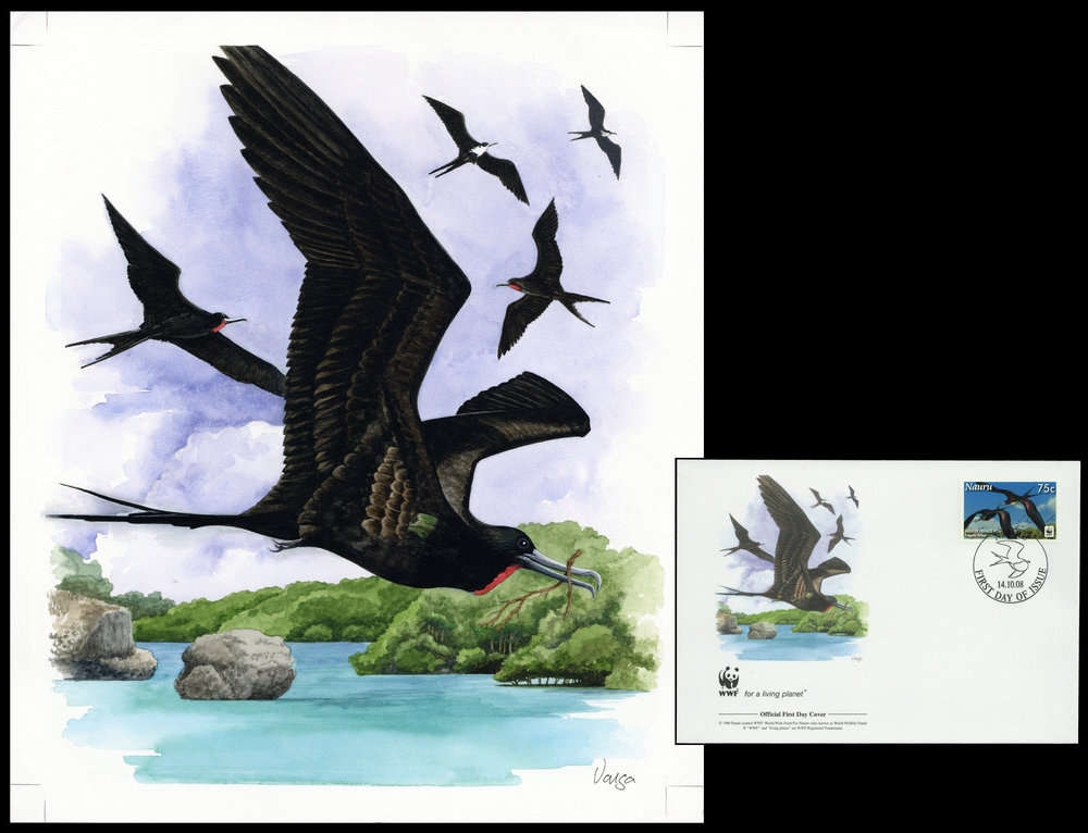 2008, Original von Hand gemaltes Kunstwerk "Bindenfregattvogel" in Farbe für den offiziellen WWF Ersttagsbriefumschlag "Bindenfregattvogel" (Fregata minor) von Nauru mit der Wertstufe zu 75 C. auf Kartonpapier in der Gesamtgröße 279x326 mm von dem Künstler Pál Varga/Ungarn.