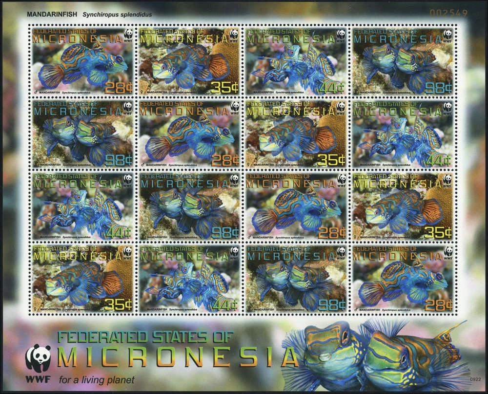 2009, 4 Werte Mandarinfisch aus Mikronesien als postfrischer WWF-Zusammendruck- Kleinbogen mit insgesamt 4 kompletten Sätzen