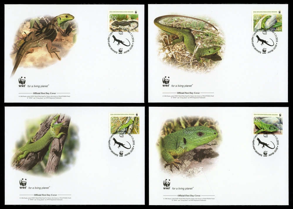 2010, 4 Werte Riesen-Smaragdeidechse aus Bosnien-Herzegowina jeweils auf dekorativem WWF Ersttagsbrief