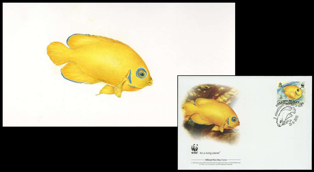2010, Original von Hand gemaltes Kunstwerk "Zitronen-Zwergkaiserfisch" in Farbe für den offiziellen WWF Ersttagsbriefumschlag "Zitronen-Zwergkaiserfisch" (Centropyge flavissima) von den Pitcairn-Inseln mit der Wertstufe zu 60 C. auf Kartonpapier in der Gesamtgröße 284x160 mm von der Künstlerin Sue Wickison/Neuseeland, die auch die Originalmarken der WWF Ausgabe entworfen hat!