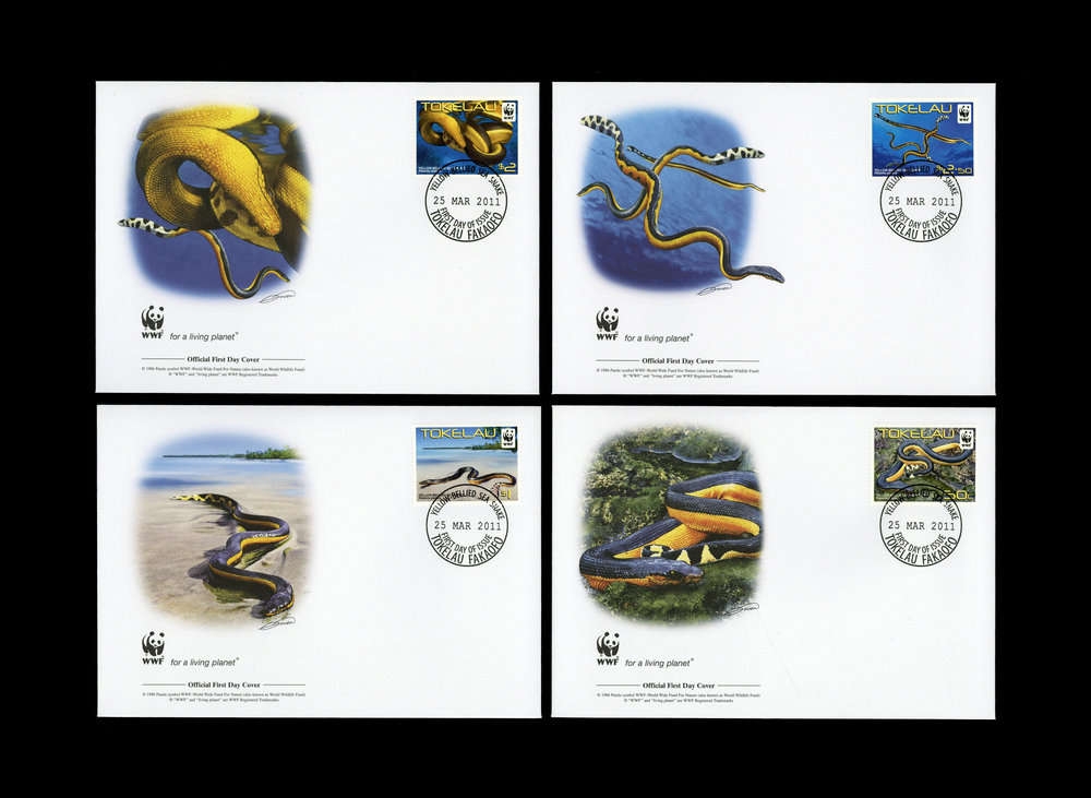 2011, 4 Werte Plättchen-Seeschlange aus Tokelau jeweils auf attraktivem WWF Ersttagsbrief