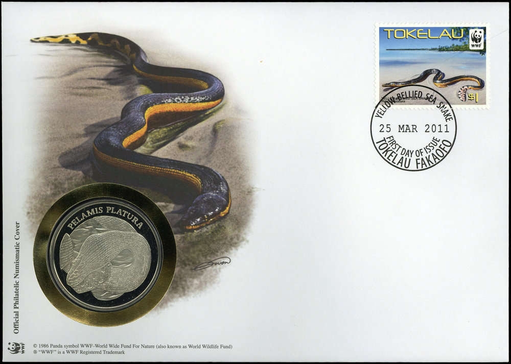 2011, 1 NZ$ Plättchen-Seeschlange von den Tokelau Inseln auf dekorativem und offiziellem WWF-Numisbrief mit passendem Ersttagsstempel und der WWF Sondermünze "Plättchen-Seeschlange - Pelamis platura"