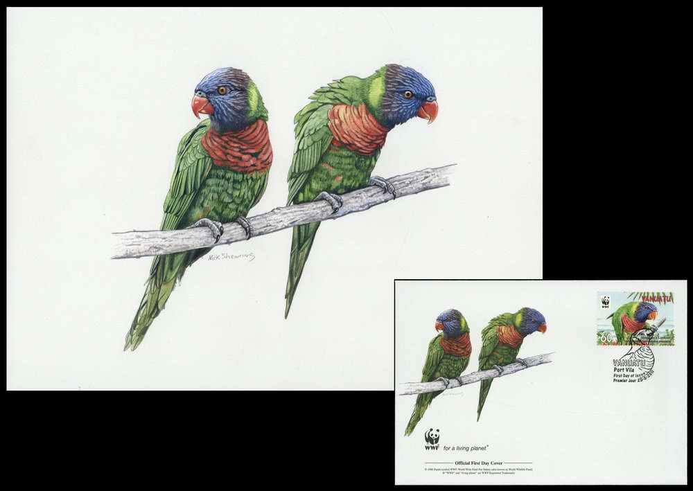 2011, Original von Hand gemaltes Kunstwerk "Allfarblori" in Farbe für den offiziellen WWF Ersttagsbriefumschlag "Allfarblori" (Trichoglossus haematodus) von Vanuatu mit der Wertstufe zu 60 VT. auf Karton in der Gesamtgröße 299x215 mm von dem Künstler Nick Shewring/Großbritannien.