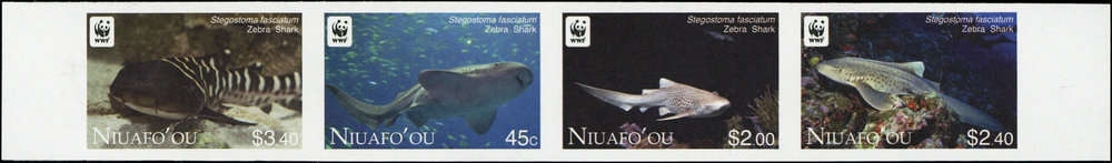 2012, 4 Werte WWF "Zebrahai" als postfrischer ungezähnter waagerechter WWF-Zusammendruck 4-er Streifen in der Anordnung MiNr.444/441/442/443 U. Ein äußerst seltener Zusammendruck, die selbst in der Preisliste 2013 der Fa.Groth AG "Spezielle Ausgaben WWF" nicht angeboten wurde!