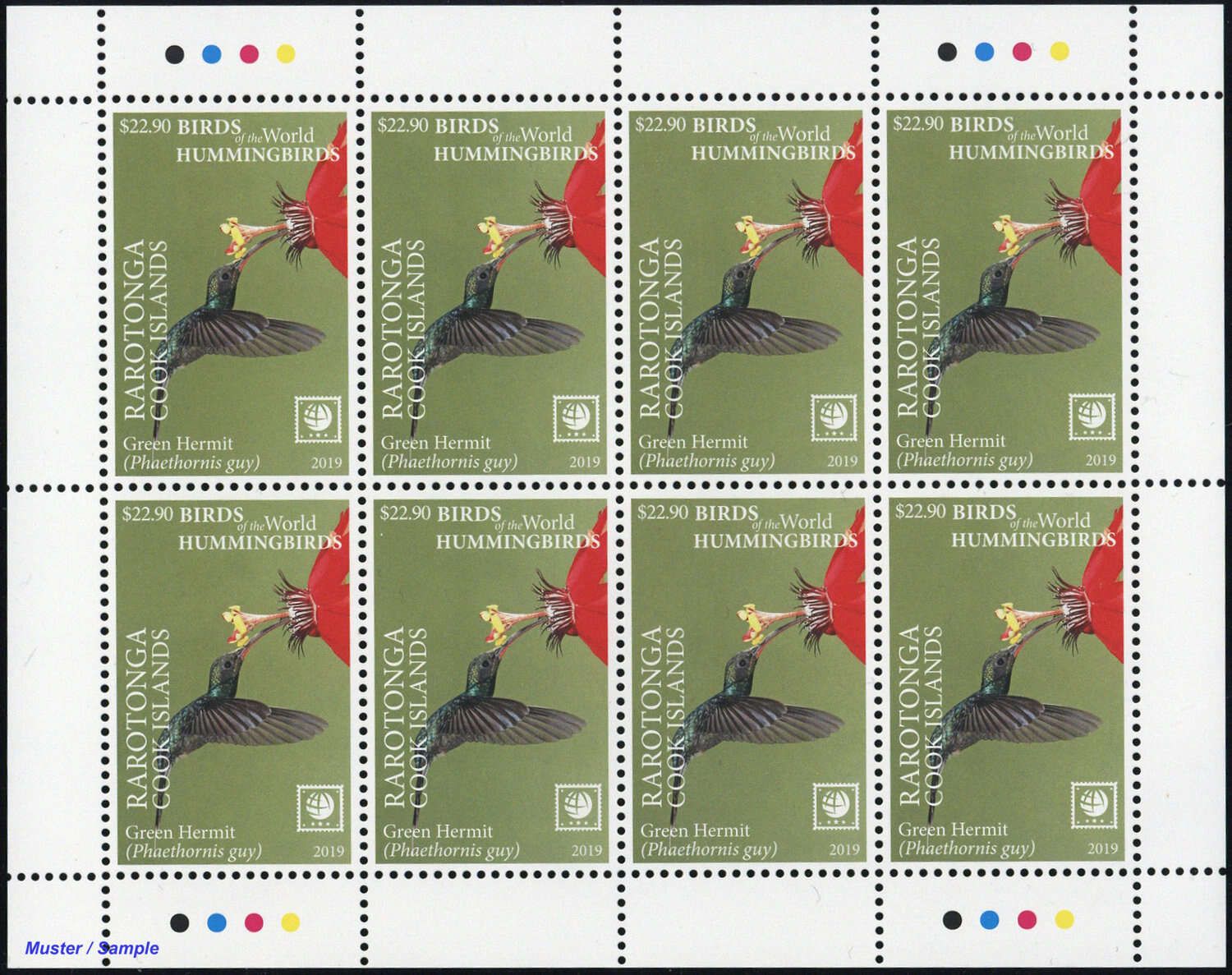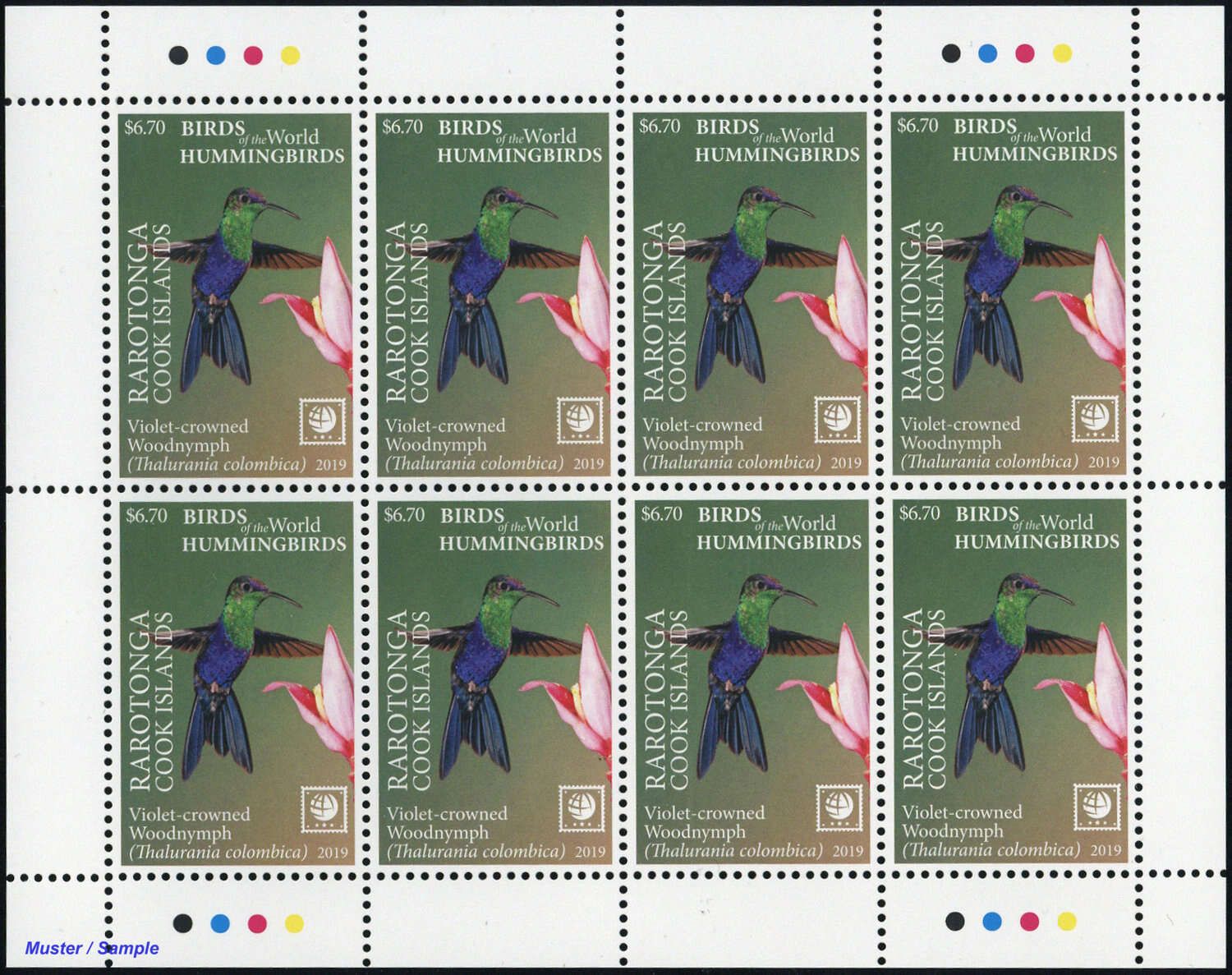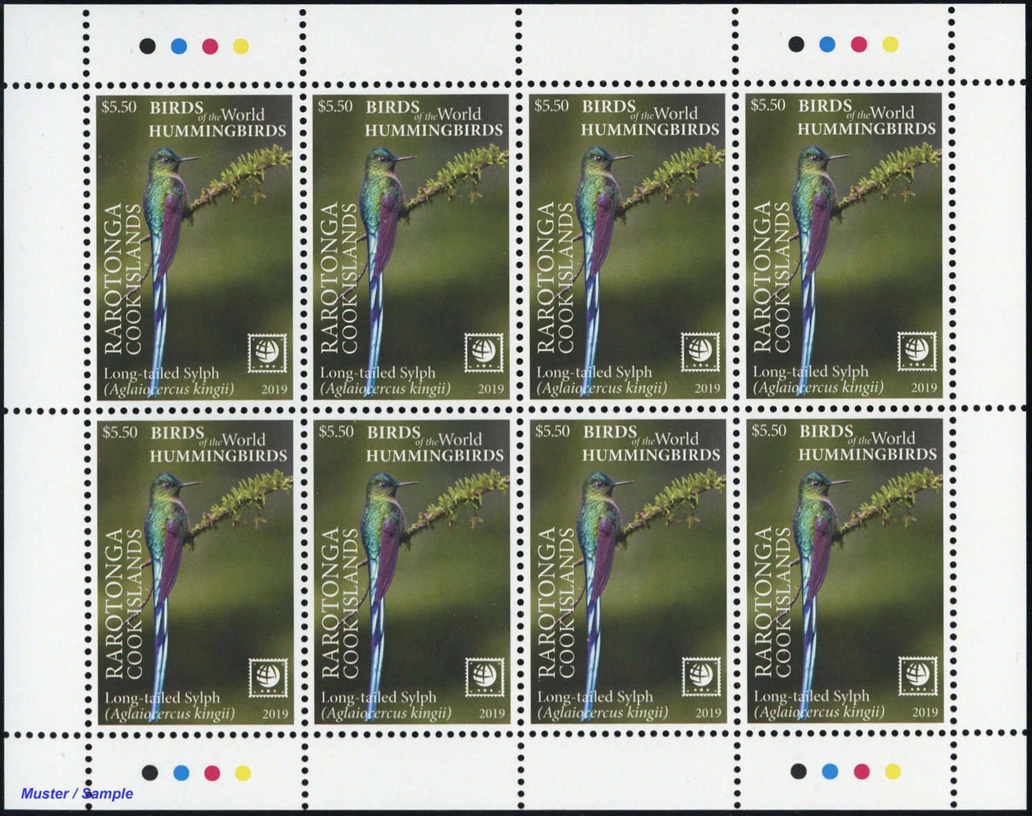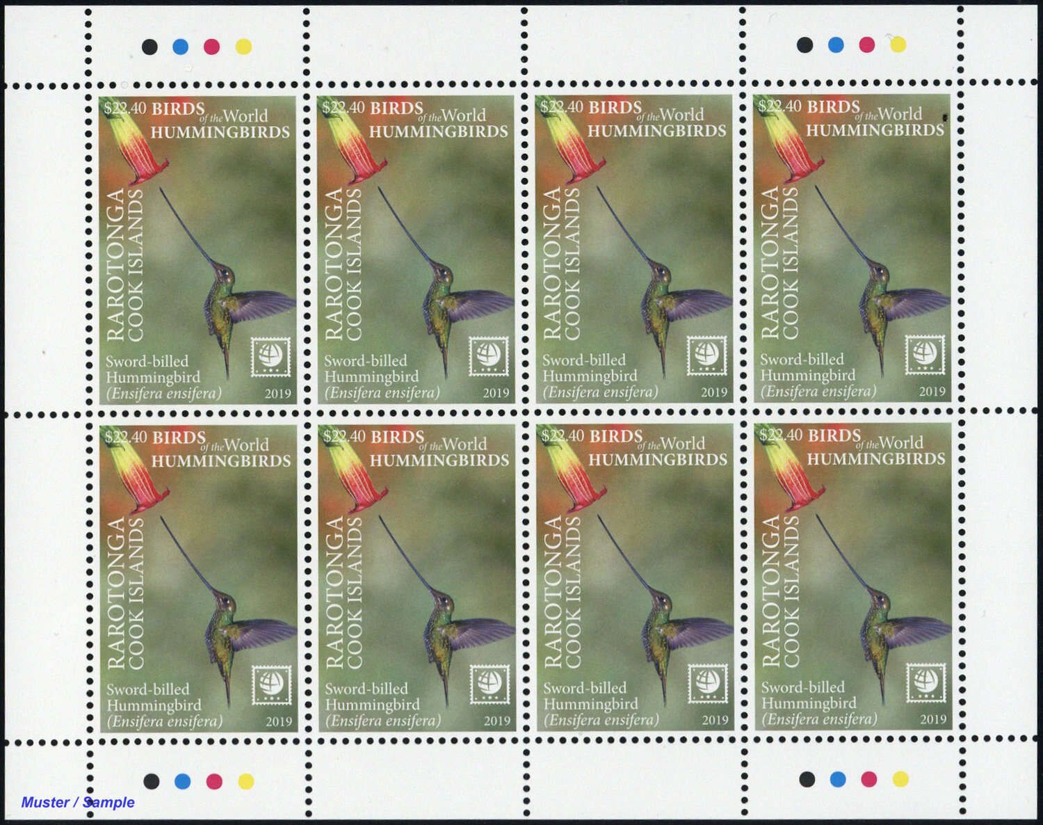 2019, 4 Kleinbogen Kolibris (Himmelssylphe, Violettkronennymphe, Schwertschnabelkolibri und Grüner Schattenkolibri) mit insgesamt 8 Sätzen in postfrischer Erhaltung