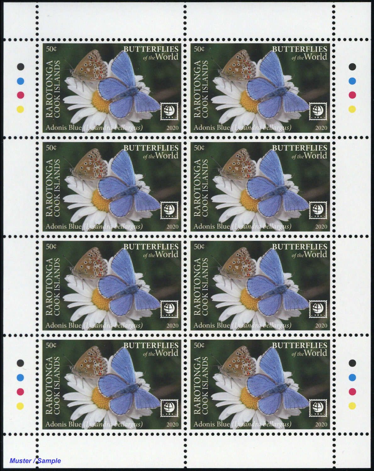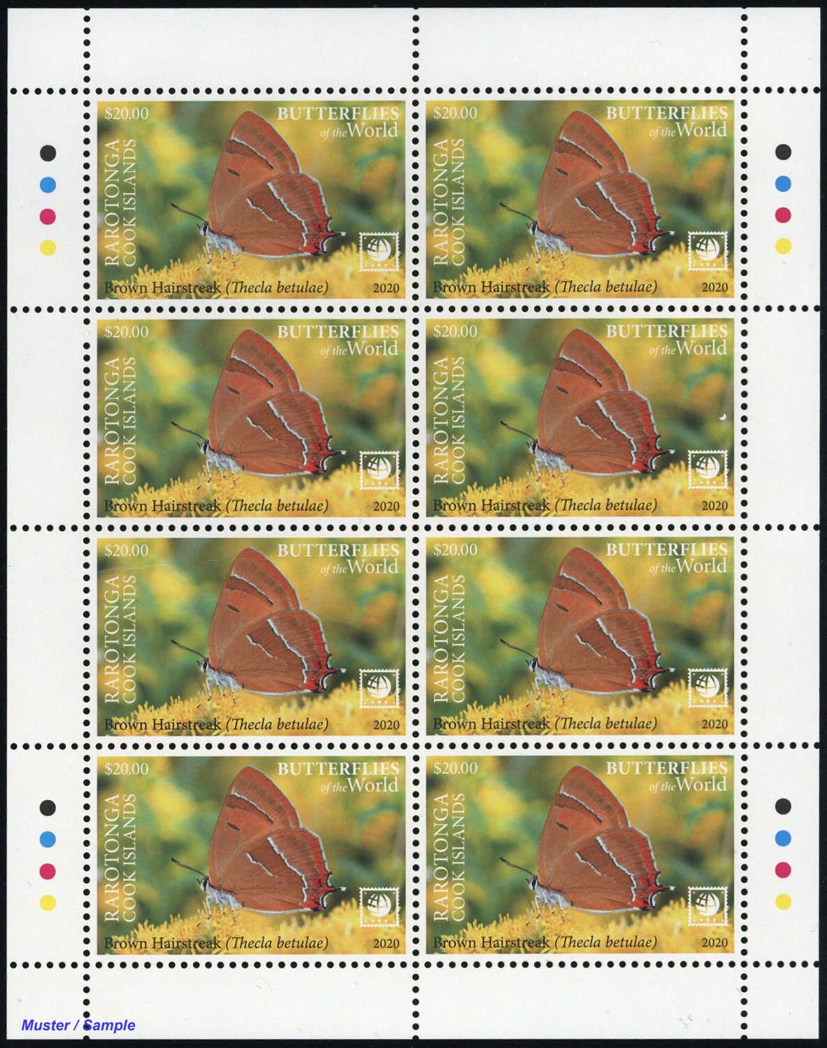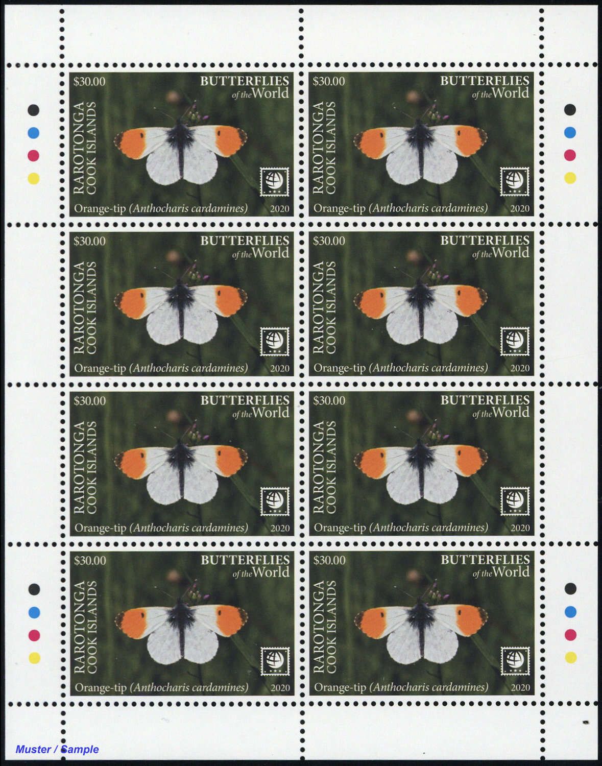 2020, 8 Kleinbogen Schmetterlinge (Himmelblauer Bläuling, Pflaumen-Zipfelfalter, Schwarzkolbiger Braun-Dickkopffalter, Kronwicken-Dickkopffalter, Wachtelweizen-Scheckenfalter, Nierenfleck-Zipfelfalter, Aurorafalter und Rostfarbiger Dickkopffalter) mit insgesamt 8 Sätzen in postfrischer Erhaltung