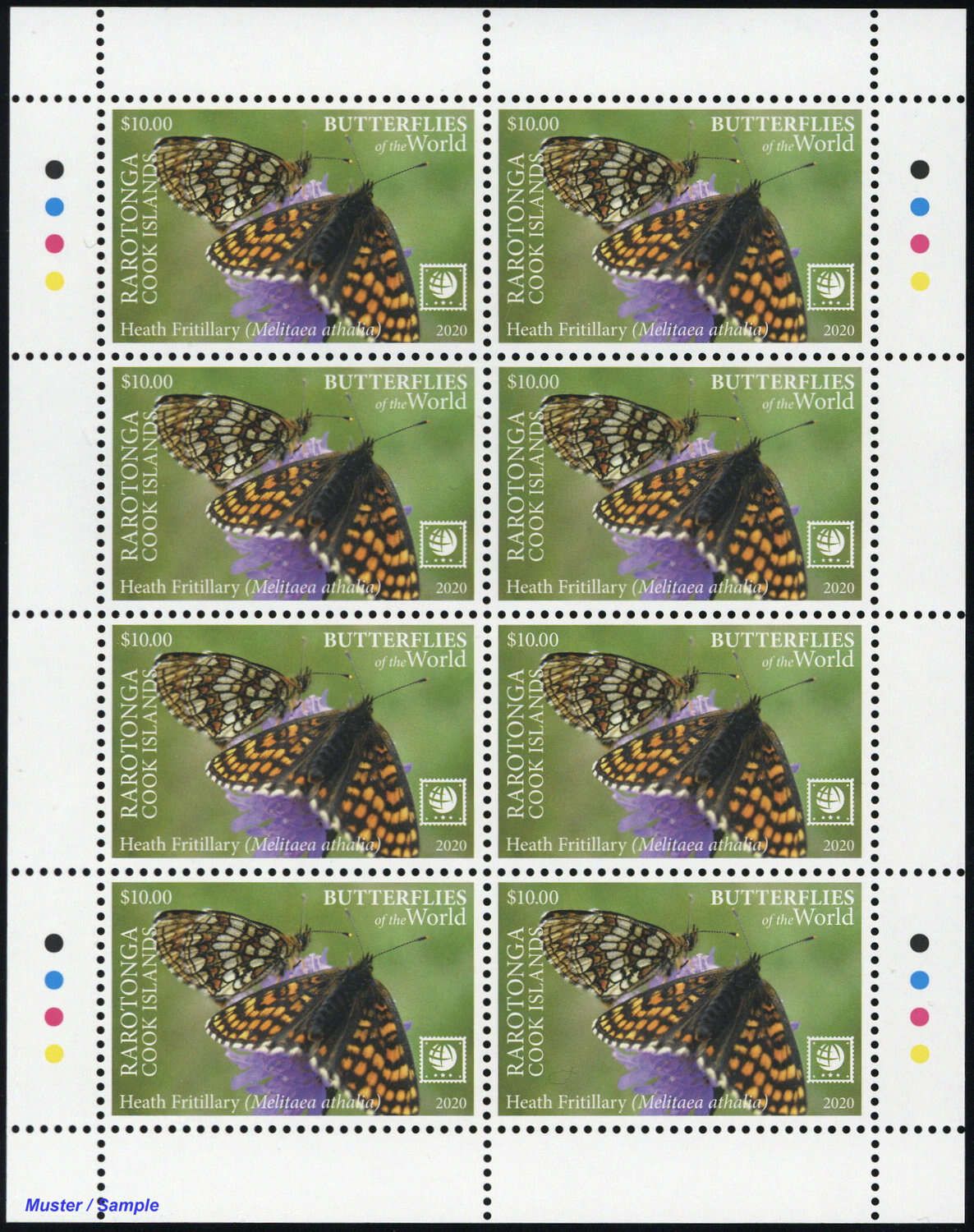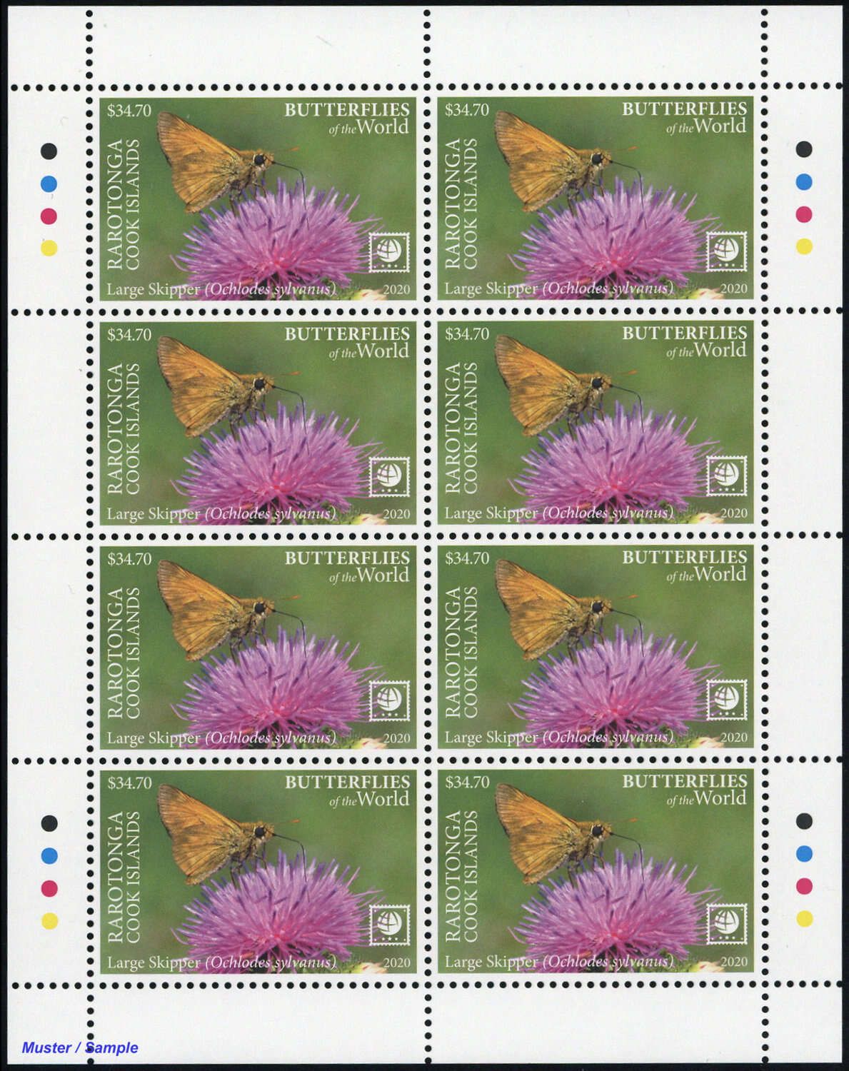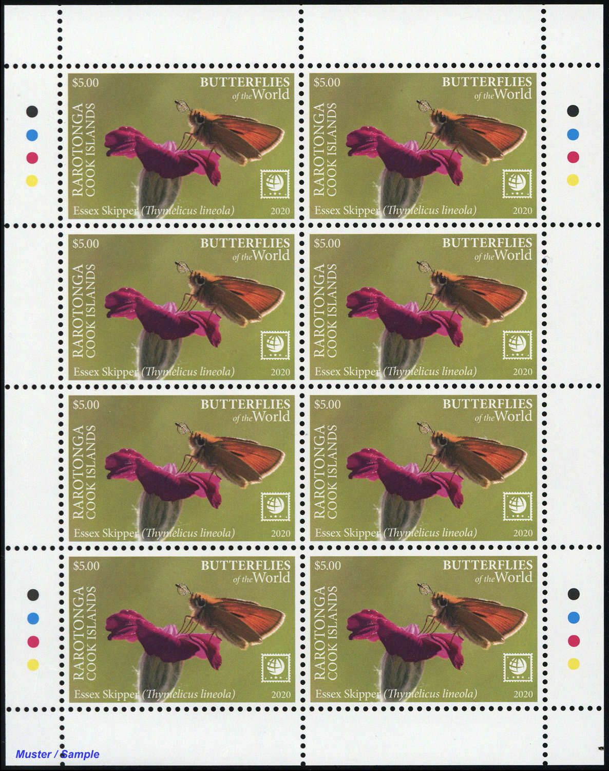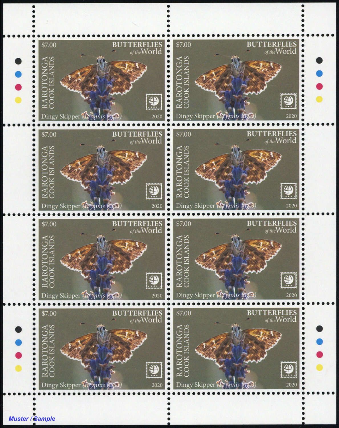 2020, 8 Kleinbogen Schmetterlinge (Himmelblauer Bläuling, Pflaumen-Zipfelfalter, Schwarzkolbiger Braun-Dickkopffalter, Kronwicken-Dickkopffalter, Wachtelweizen-Scheckenfalter, Nierenfleck-Zipfelfalter, Aurorafalter und Rostfarbiger Dickkopffalter) mit insgesamt 8 Sätzen in postfrischer Erhaltung