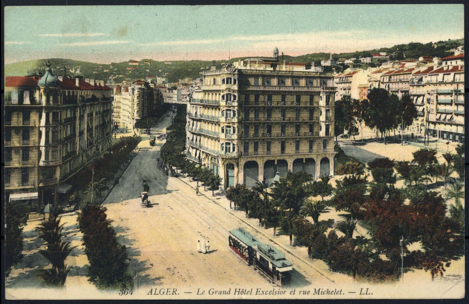 Alger, farbige AK (Hotel Excelsior, rue Michelet), "ALGER 26 3 13", K1 auf 10 C Semeuse, Alters- Beförderungsspuren, nach Schlettstadt
