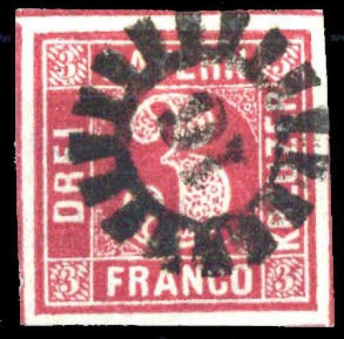 "16", klar fast kopfstehend auf voll-breitrandiger 3 Kr. rot